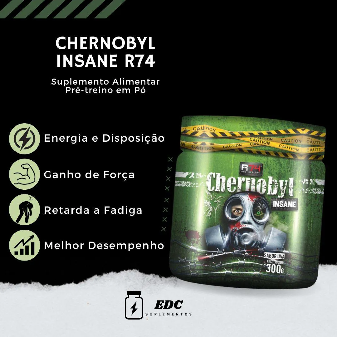 Chernobyl Insane é o um suplemento pré-treino da marca R74, o qual foi o “primogênito” de uma geração totalmente nova de suplementos destinados a pessoas que buscam maior força, pump muscular, foco e concentração. Sua fórmula inovadora e ingredientes diferenciados fizeram o produto cair no gosto popular de atletas e esportistas, tornando-se um dos pré-treinos mais adorados e vendidos do Brasil.