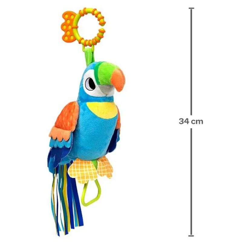 Ela oferece vários estímulos ao bebê: o chocalho aguça a audição, o mordedor massageia as gengivas, a argola e as fitas despertam o tato, e as cores vibrantes exercitam a visão.
