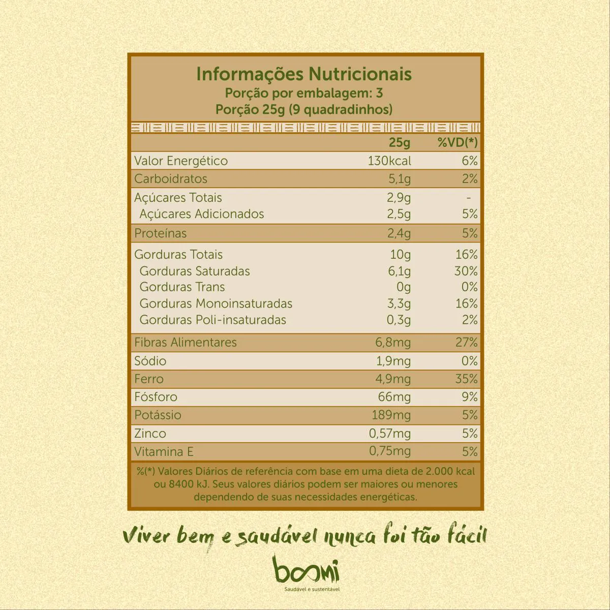 Ingredientes: 70% cacau orgânico (67% cacau, 4% manteiga de cacau)*, 19% fibra inulina**, 9,5% açúcar demerara orgânico*, 0,5% emulsificante lecitina de girassol **. NÃO CONTÉM GLÚTEN.