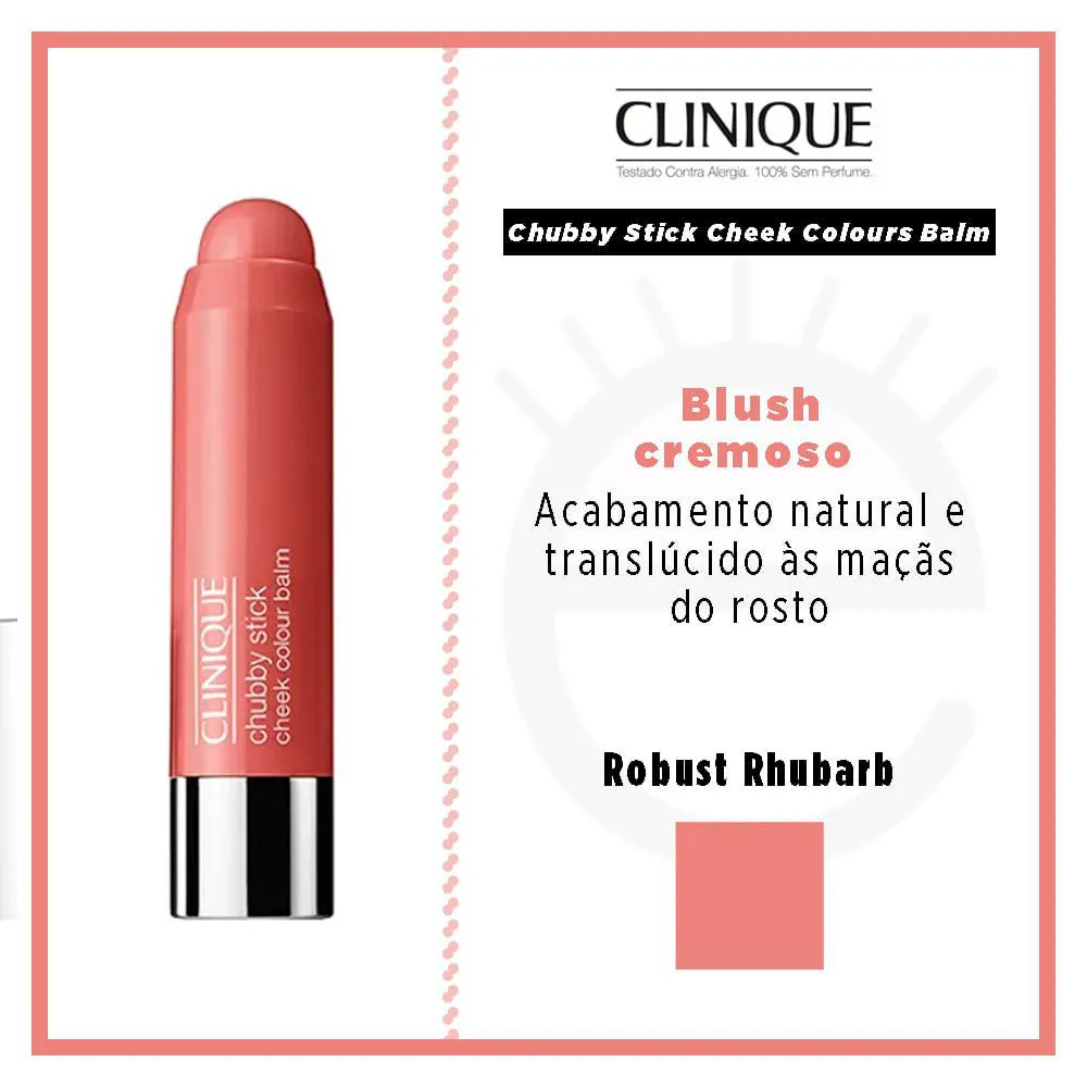 O Chubby Stick Cheek Colours Balm da marca Clinique é um blush cremoso que proporciona acabamento natural e translúcido às maçãs do rosto. Além disso, o bastão de blush é super prático de usar e de levar para onde você desejar, e isso permite que você fique livre para aplicar e reaplicar onde estiver e quando quiser.