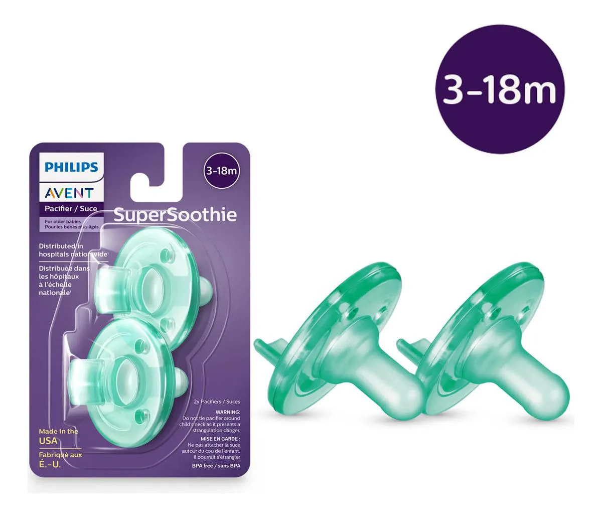 A Philips Avent SuperSoothie é uma chupeta desenvolvida para oferecer conforto e segurança para o bebê. Muito utilizada em hospitais, possui design anatômico que ajuda a acalmar o bebê de forma natural.Ideal para bebês de 3 a 18 meses