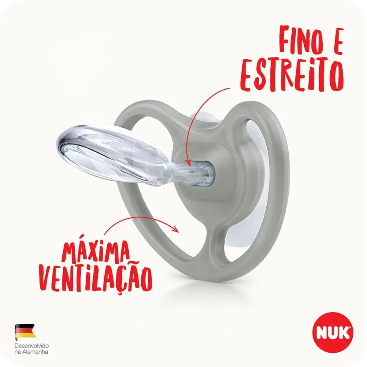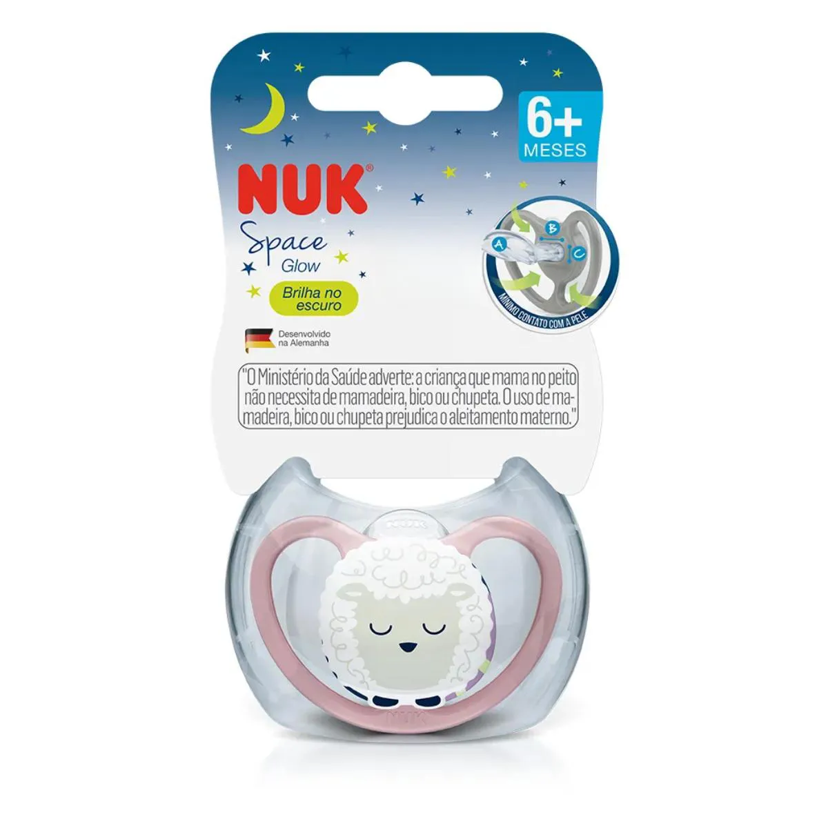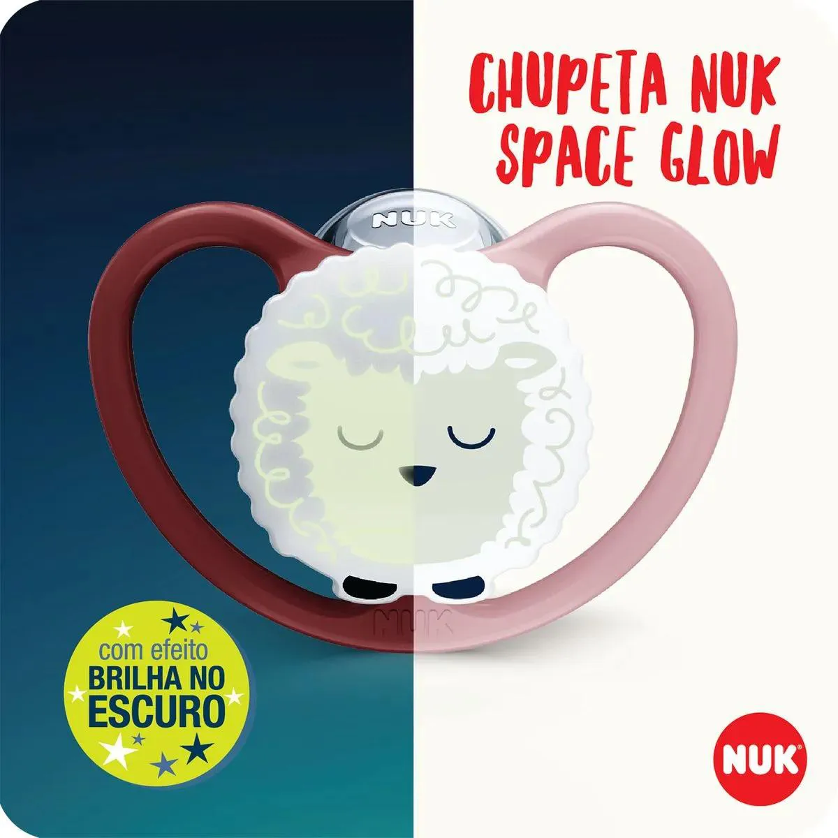 A Chupeta NUK Space Glow brilha no escuro e pode ser encontrada rapidamente, sem precisar acender a luz durante a noite Sua tecnologia "brilha no escuro" não é tóxica e não faz mal a saúde da criança A NUK Space foi desenvolvida com canais extragrandes de ventilação para permitir a máxima circulação de ar, possibilitando que a pele sensível respire.