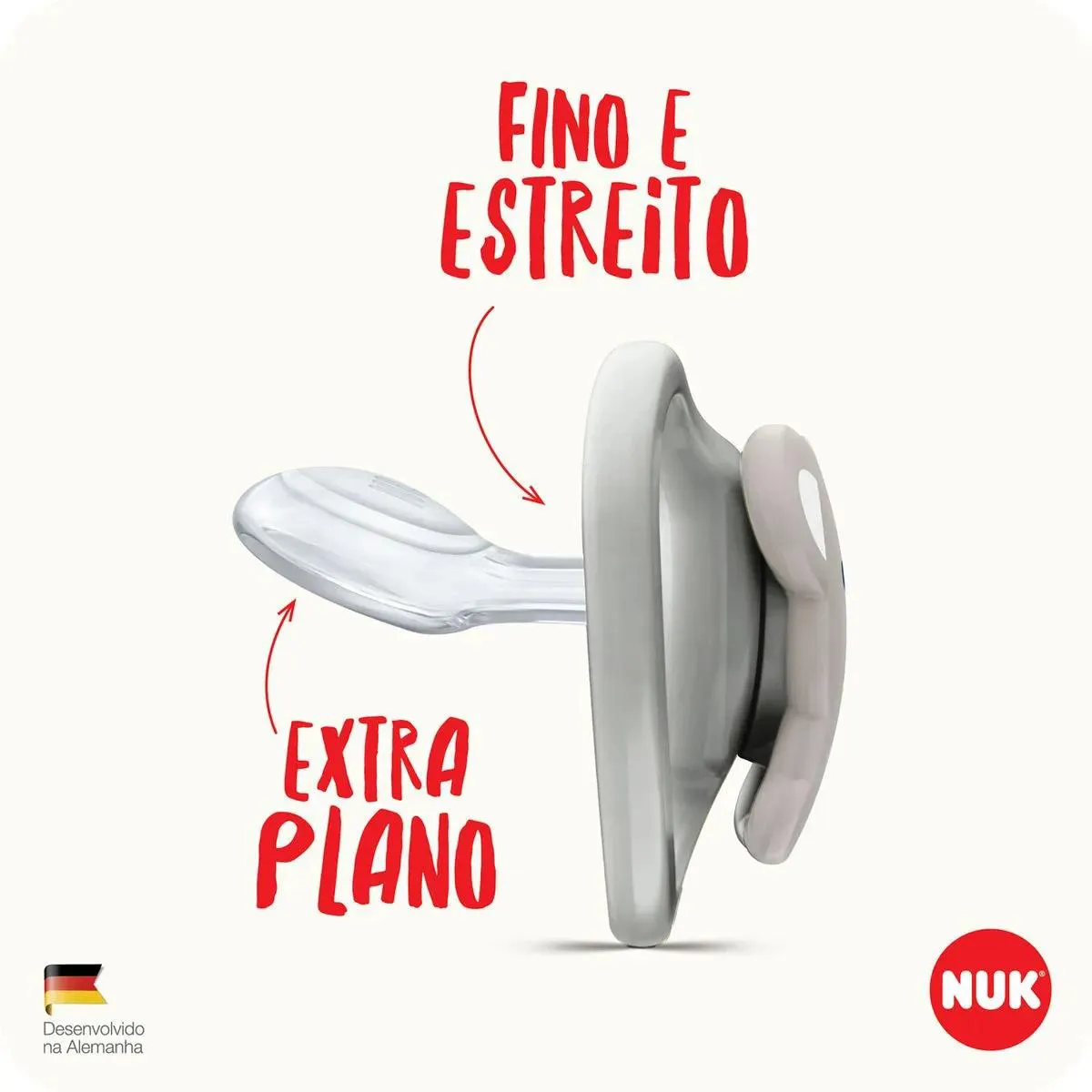 O design do escudo em 3D é moderno, leve e arejado Seu bico em silicone é 35% mais fino, além de ser mais estreito. Possui um estojo protetor que pode ser utilizado no micro ondas para higienização da chupeta e também para o transporte.