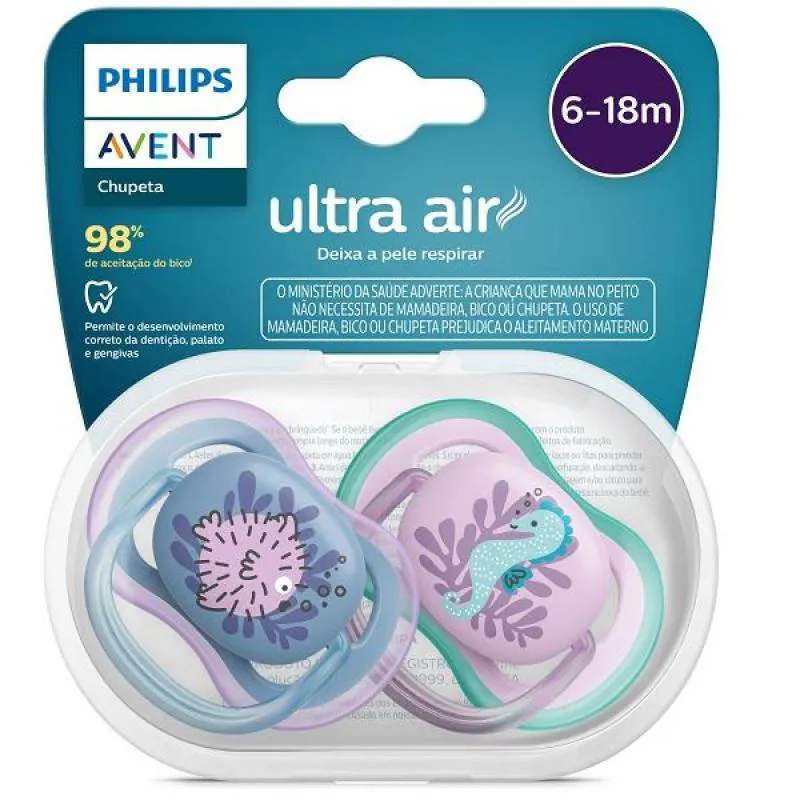A Chupeta Ultra Air Philips Avent é um acessório infantil desenvolvido em silicone macio e flexível, projetado especificamente para bebês entre 6 e 18 meses. Possui design ortodôntico, escudo leve e bordas arredondadas, sendo fabricada com material seguro e livre de BPA.