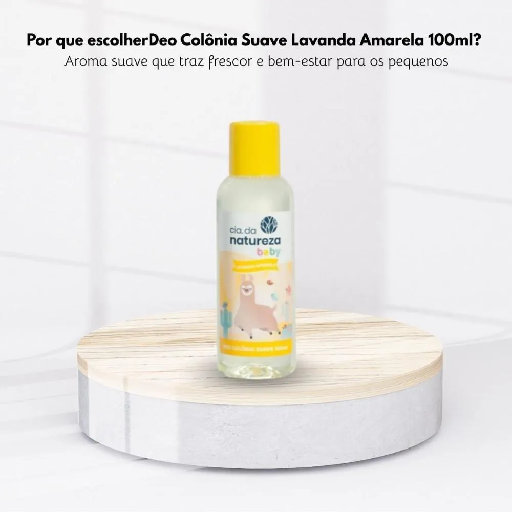 A Cia da Natureza Deo Colônia Baby Lavanda Amarela 100 ml foi desenvolvida especialmente para proporcionar um cheirinho suave, confortável e duradouro ao bebê. Sua fragrância delicada transmite sensação de frescor e bem-estar, deixando a pele perfumada o dia todo sem causar irritações. Ideal para uso diário após o banho ou na troca de roupas.- Benefícios (2 principais): Fragrância suave e sensação de frescor prolongada.