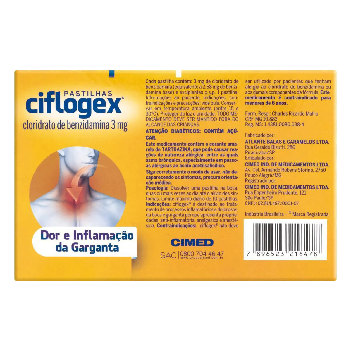 Quando não deve tomar este medicamento: Ciflogex não deve ser utilizado por pacientes que tenham alergia ao cloridrato de benzidamina ou aos demais componentes da fórmula. Este medicamento é contraindicado para menores de 6 anos. Para Ciflogex pastilha nos sabores laranja, mel – limão, menta – limão e cereja:Atenção diabéticos: contém açúcar. Para Ciflofex® pastilha nos sabores menta – limão diet, menta – limão e mel – limão: Este produto contém o corante amarelo de TARTRAZINA que pode causar reações de natureza alérgica, entre as quais asma brônquica, especialmente em pessoas alérgicas ao ácido acetilsalicílico.