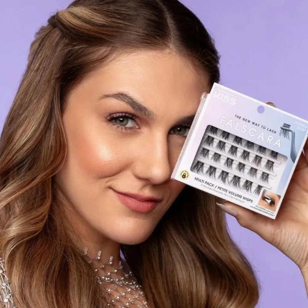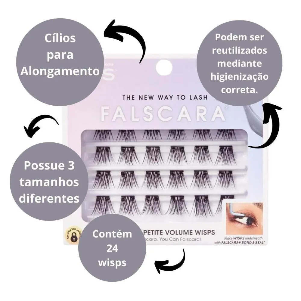KISS FALSCARA é uma nova forma de alongar seus cílios! Uma extensão de cílios perfeita, bem mais rápida, com menos complicações e menos despesas. O Falscara Wisps, possui uma tira ultrafina e fios leves como uma pluma, garantindo um acabamento premium. Deve ser aplicado abaixo dos cílios naturais para um acabamento perfeito e confortável. - Tiras ultrafinas e fios leves para cílios. - Possuem 3 tamanhos diferentes, dentro da caixa: S - Pequeno, M - Médio e L - Longo. - Contém 24 WISPS. - Podem ser reutilizados mediante higienização correta. - Feito de fios sintéticos. . Modo de Usar: PASSO 1: Aplique uma camada fina do BOND nos seus cílios naturais; PASSO 2: Use o APPLICATOR FALSCARA para retirar o WISP da bandeja. Um a um, aplique gentilmente os WISPS por baixo da base dos seus cílios naturais, começando pelo canto externo do olho. PASSO 3: Aplique uma fina camada do SEAL por baixo dos WISPS. Essa etapa final elimina qualquer resíduo e mantém os WISPS no lugar. PASSO 4: Para um uso prolongado de até 10 dias, aplique o OVERNIGHTER abaixo dos WISPS. Sua fórmula mais forte ajuda a prolongar o uso dos WISPS, mantendo-os no lugar e em boa condição por muito mais tempo. . REMOÇÃO: Pegue um algodão e aplique o REMOVER. Coloque sobre seus olhos, mantenha por 10 segundos e limpe gentilmente para remover os WISPS, BOND&SEAL e OVERNIGHTER. . Composição: Fios sintéticos a base de polietileno tereftalato. . ATENÇÃO: USO EXTERNO. MANTENHA FORA DO ALCANCE DAS CRIANÇAS.