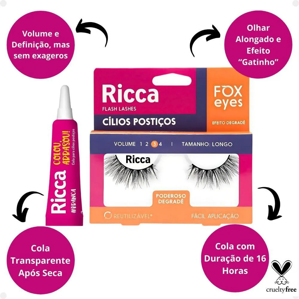 Cílios Postiços + Cola Branca Ricca Belliz Fox Eyes Poderoso Degradê Vol:3 Longo Cód.2693