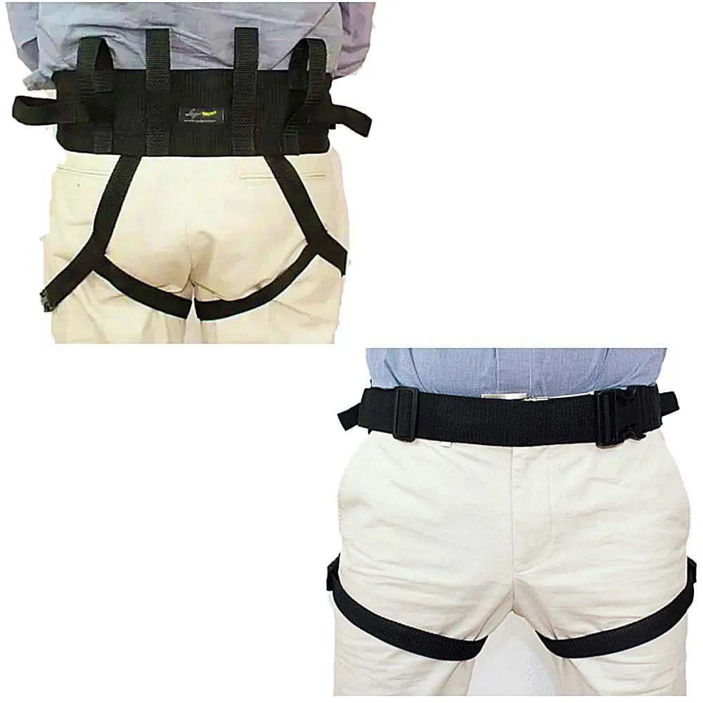 Alças extras integradas ao corpo do cinto com duas presilhas de segurança, permitem que elas sejam presas ao redor das pernas do paciente, distribuindo o peso de maneira uniforme e evitando que o cinto suba no momento da movimentação.