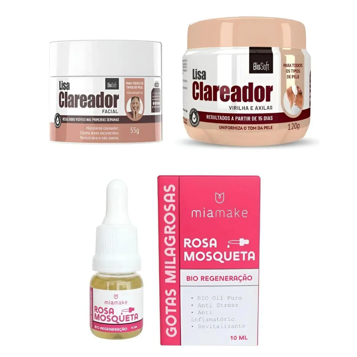 Você está em busca de uma pele radiante, sem manchas e uniforme? O Kit de Clareadores para o rosto, Coporal Virilha e Axila da Linha Lisa Bio Soft com o Óleo de Rosa Mosqueta Puro da Mia Make é a resposta para os seus desejos! Com uma fórmulas avançadas e ativos clareadores naturais, esse kit pode ser utilizado em todos os tons e tipos de pele.