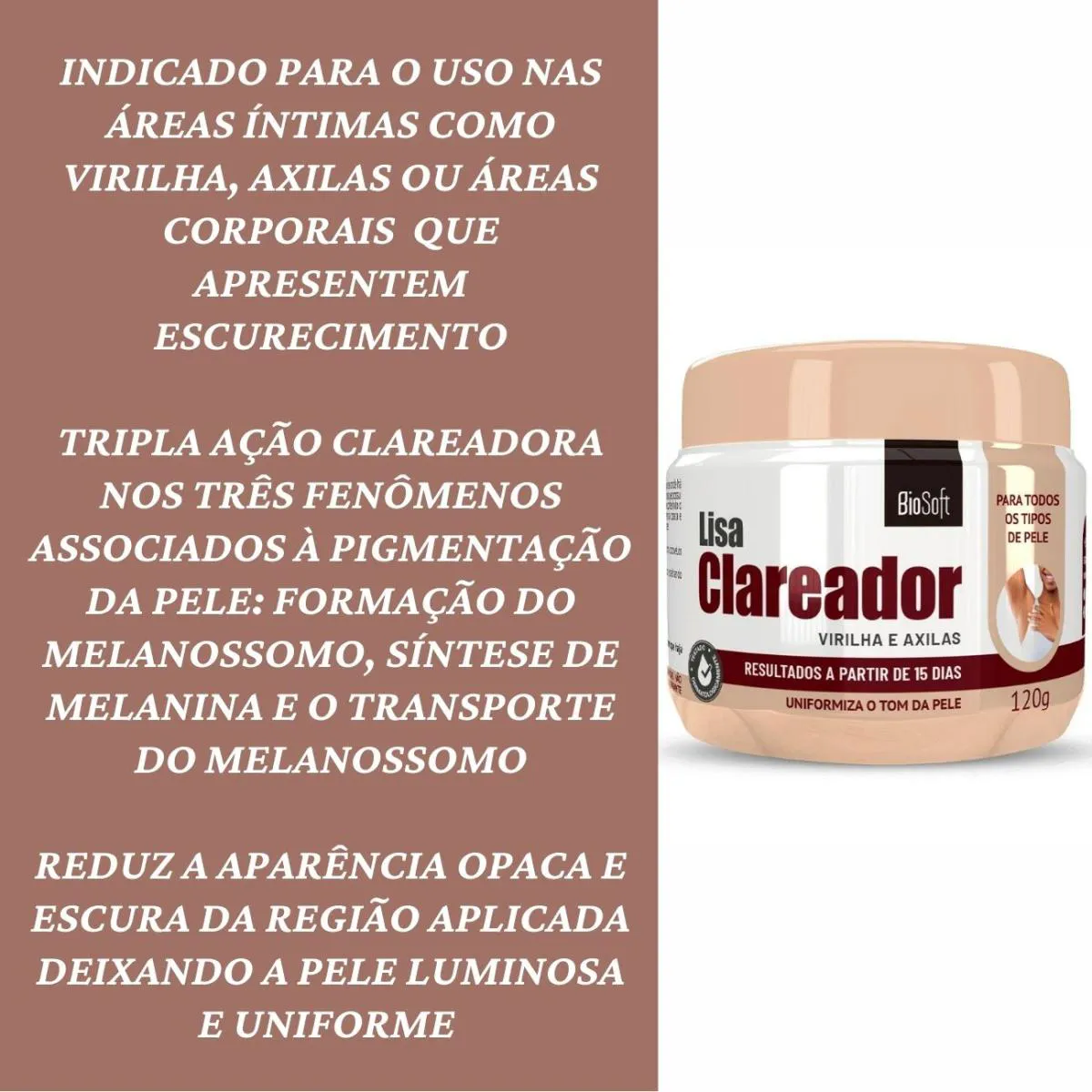 O Creme Clareador Íntimo Lisa Bio Soft é indicado para o uso nas áreas íntimas e corporais que apresentam hiperpigmentação pós- inflamatória onde a pele acaba produzindo mais melanina e escurece a região.