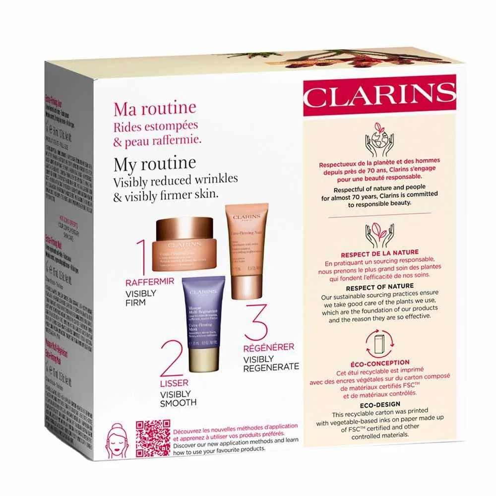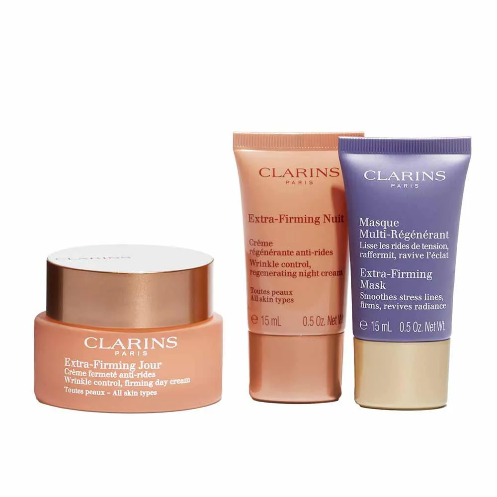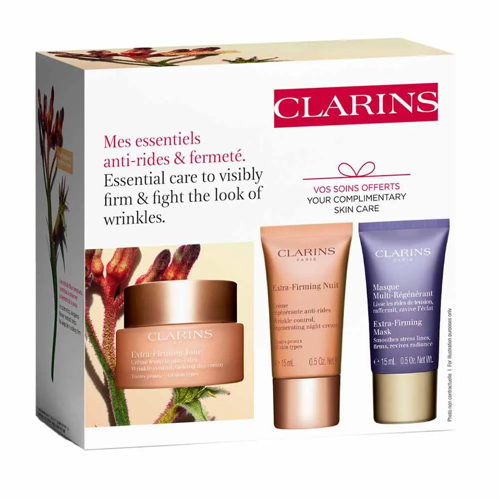 - Extra Firming Day Cream: Um creme firmador diurno que proporciona uma pele visivelmente mais firme e cheia de vitalidade. Garante um efeito alisador imediato e, com o uso contínuo, reduz visivelmente a flacidez e rugas, remodelando os contornos do rosto e revelando a juventude dos traços. Além disso, o Complexo antipoluição exclusivo da Clarins protege a pele contra agressores externos.