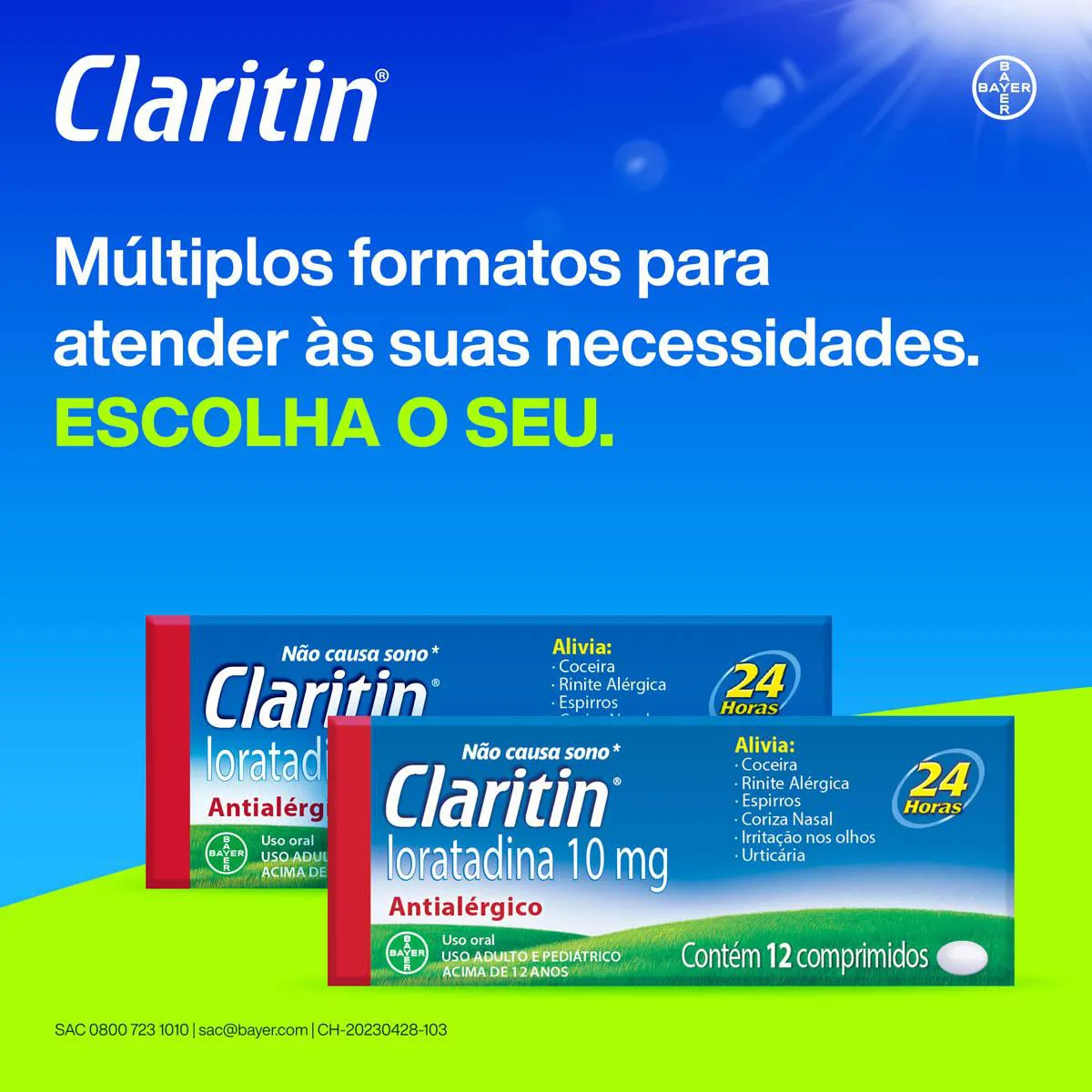 Claritin® é indicado para o alívio dos sintomas associados com a rinite alérgica, como: coceira nasal, nariz escorrendo (coriza), espirros, ardor e coceira nos olhos. Claritin® também é indicado para o alívio dos sinais e sintomas da urticária e de outras alergias da pele.
