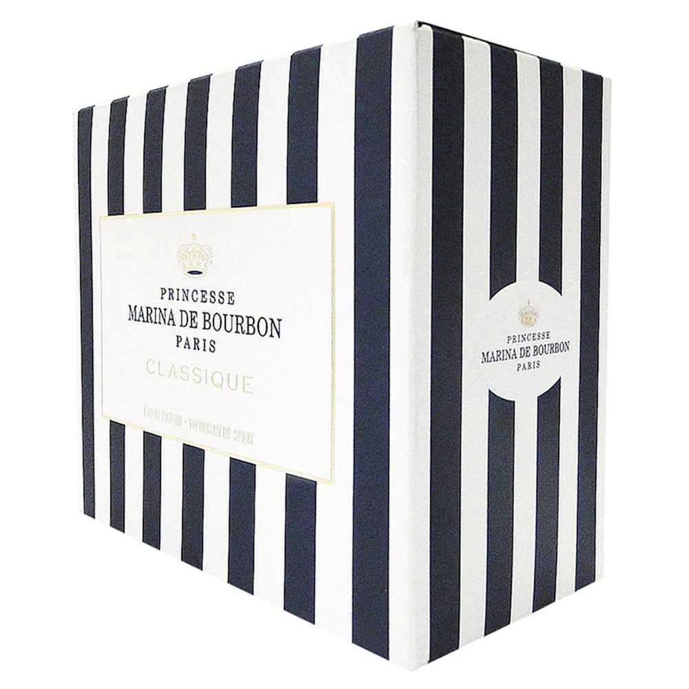 Lançado em 1995 pela própria princesa, o perfume feminino Classique Marina de Bourbon Eau de Parfum da marca Marina de Bourbon é uma fragrância floral frutal e, antes de tudo, sinônimo de classe e elegância. Inspirada no perfume dos jardins do seu castelo, tem um aroma doce e ao mesmo tempo exótico. Para a mulher clássica, elegante e extremamente feminina.