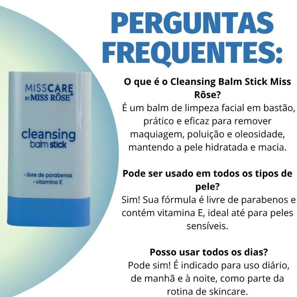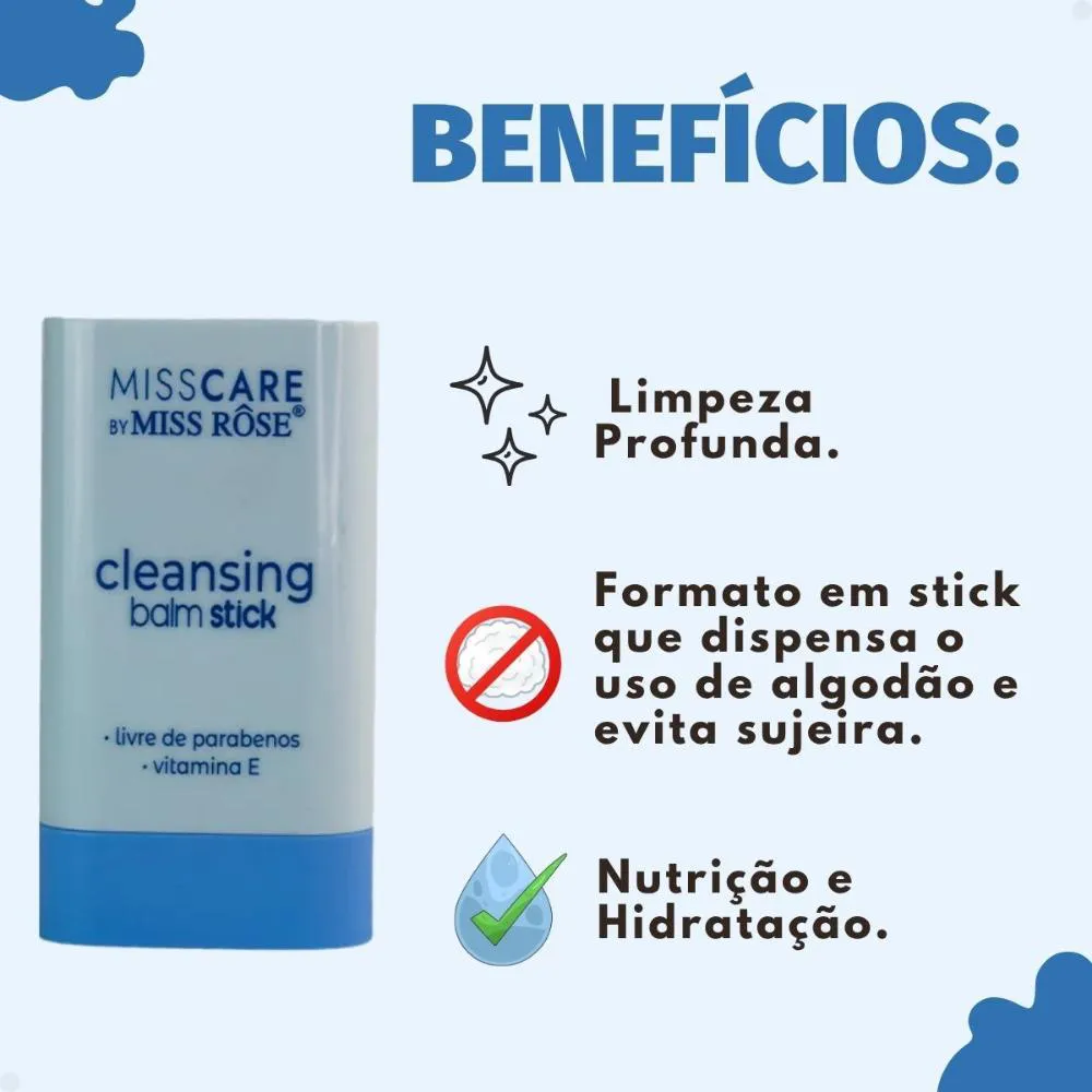 O Cleansing Balm Stick Miss Care By Miss Rose da MISS ROSE é a chave para uma rotina de beleza prática e eficiente. Imagine remover toda a sua maquiagem, até aquela à prova d'Água, com um único gesto suave. Este balm inovador em formato stick não só dissolve a maquiagem, mas também nutre sua pele, deixando-a incrivelmente limpa, macia e radiante. Perfeito para mulheres modernas que buscam soluções rápidas e eficazes para o cuidado da pele, ele se tornará seu aliado indispensável, seja em casa ou em viagens.Benefícios Principais