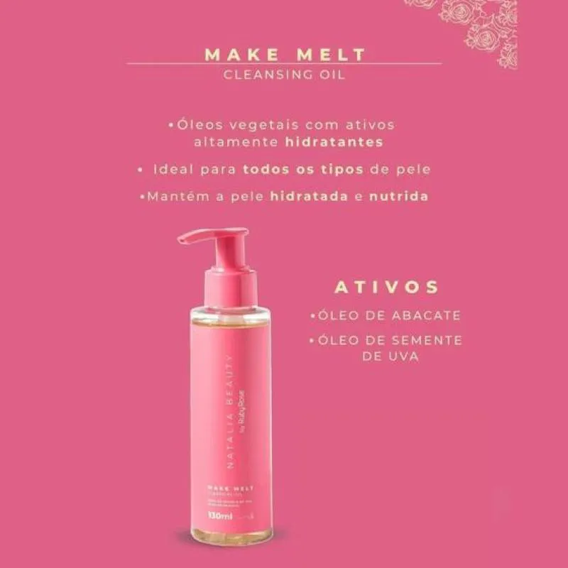 Cleasing oil make melt 130ml - natalia beauty by ruby rose O Cleansing Oil Make Melt foi desenvolvido para remover até as maquiagens mais resistentes sem agredir a pele. Com textura leve e emoliente, ele dissolve impurezas, protetor solar e poluição com facilidade. Enriquecido com óleos nutritivos, como semente de uva e abacate, deixa a pele limpa, macia e hidratada, sem obstruir os poros e sem deixar a sensação de oleosidade.