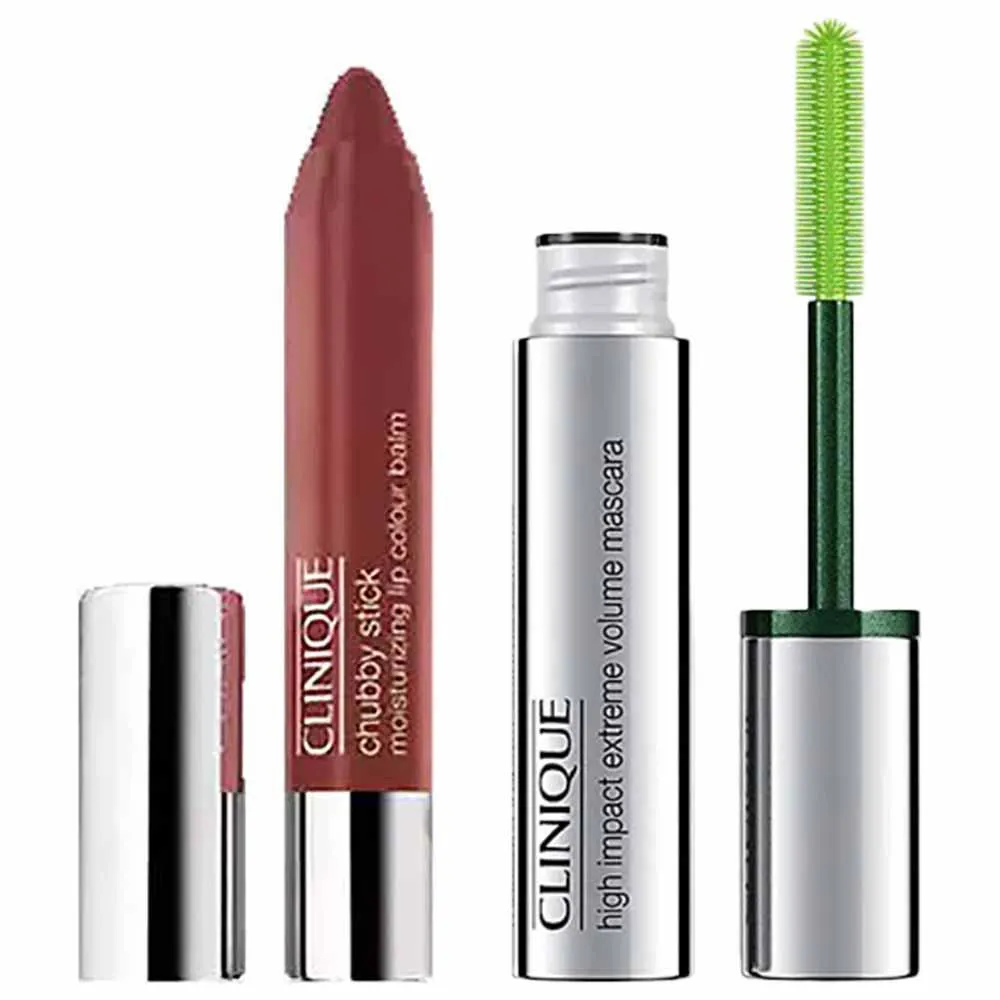 O kit é uma combinação de dois produtos cosméticos da marca Clinique: uma máscara de cílios e um batom labial hidratante, destinado a realçar a maquiagem e cuidar dos cílios e lábios.