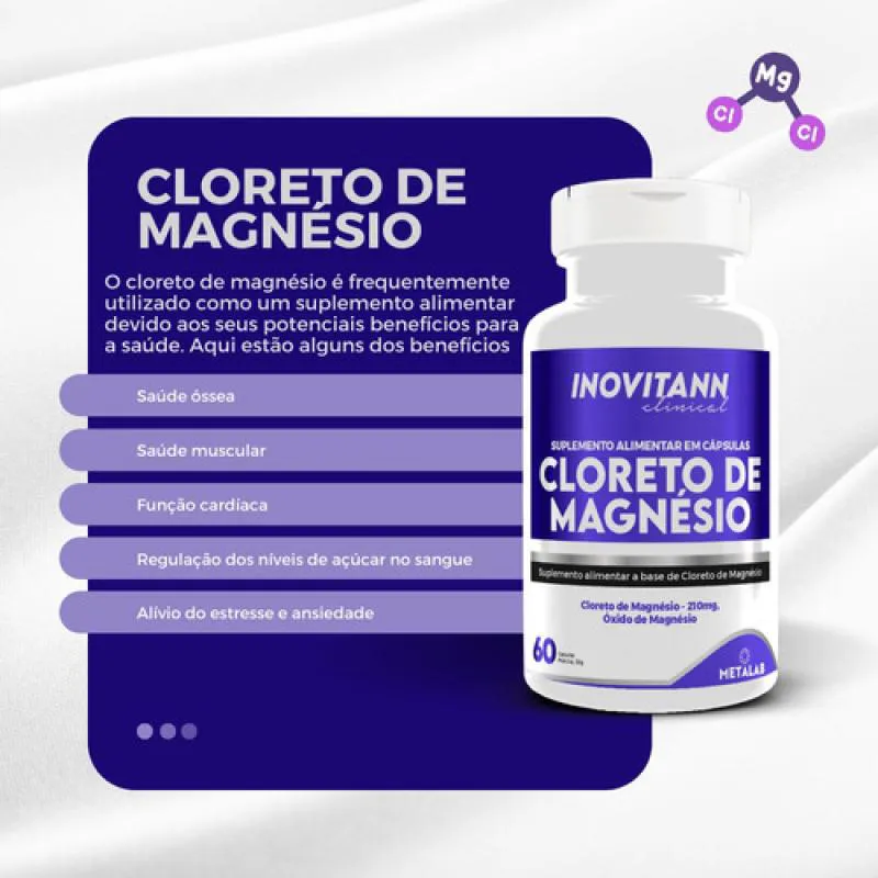 - Função cardíaca: O magnésio desempenha um papel importante na regulação do ritmo cardíaco e na saúde cardiovascular geral. A suplementação de cloreto de magnésio pode ajudar a manter a função cardíaca normal e reduzir o risco de doenças cardíacas.