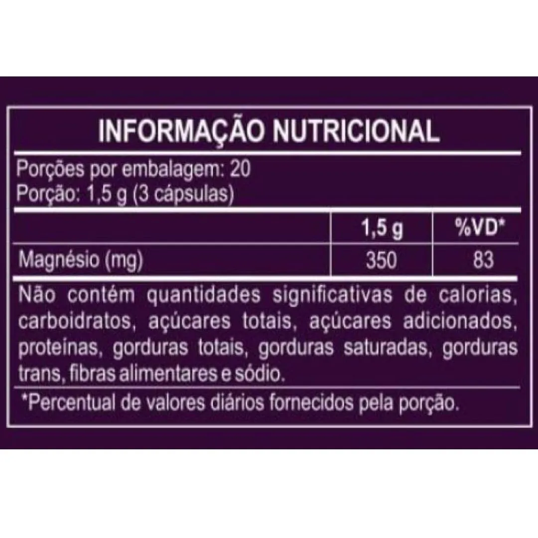 INGREDIENTES: Bisglicinato de magnésio e cloreto de magnésio. Silicato de magnésio, antiumectantes dióxido de silício e fosfato tricálcico. Composição da cápsula: gelificante gelatina e corante dióxido de titanio.NAO CONTEM GLUTEN. RECOMENDAÇÃO DE USO: Ingerir 2 (duas) cápsulas ao dia. Produto recomendado para o grupo populacional ≥ 19 anos. CONSERVAÇÃO & ADVERTENCIA: Conservar ao abrigo da luz, calor e umidade. Manter em local limpo e fresco. Após aberto, consumir preferencialmente em até 60 dias. NÃO EXCEDER A RECOMENDAÇÃO DIÁRIA DE CONSUMO INDICADA NA EMBALAGEM. ESTE PRODUTO NÃO E UM MEDICAMENTO. MANTENHA FORA DO ALCANCE DE CRIANÇAS. O Cloreto de Magnésio apresenta propriedade higroscópica, o que pode ocasionar em alteração física na cápsula. Conservar o produto bem fechado, em temperatura entre 15°C 30°C e umidade relativa do ar entre 35% e 60%.
