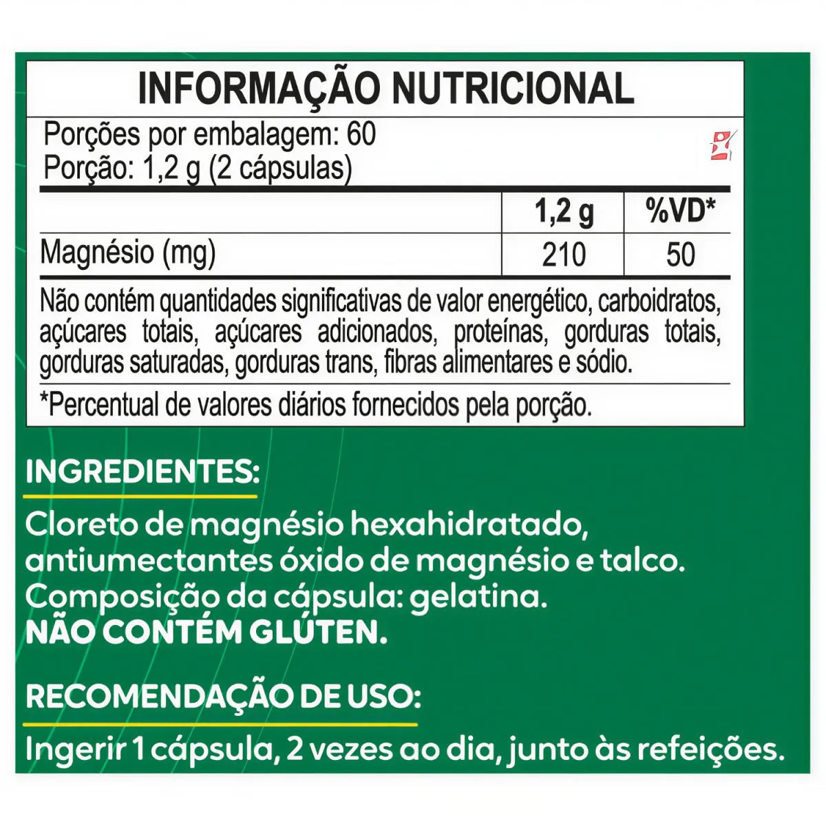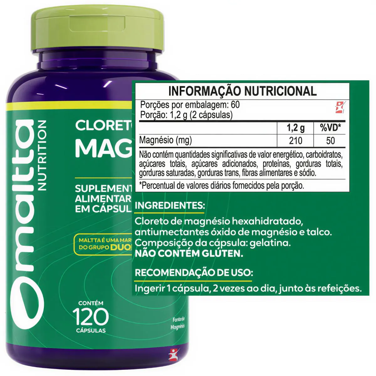CLORETO DE MAGNÉSIO P.A SUPER mineral CONCENTRADO 120 CÁPSULAS - MALTTA NUTRITION DESCRIÇÃO O Magnésio participa em mais de 350 reações enzimáticas no organismo humano. Auxilia na formação de ossos e dentes, no metabolismo energético de proteínas, de carboidratos e de gorduras. O magnésio auxilia no funcionamento muscular e neuromuscular e no equilíbrio de eletrólitos.É um poderoso complemento vitamínico mineral para quem precisa ativar hormônios e enzimas e, ainda, melhorar a função cardíaca, é um dos minerais mais importantes em nosso organismo, que contribui para melhor equilíbrio e saúde do corpo. BENEFÍCIOS - Combate dores no corpo; - Combate dores nas articulações; - Auxilia no transporte de cálcio para ossos; - Combate câimbras; - Excelente na luta contra as dores fibromialgia; - Combate dores de cabeça e enxaqueca; - Melhorar o desempenho físico, porque é importante para a contração muscular; - Auxilia na prevenção da osteoporose, porque ajuda a produzir hormônios que aumentam a formação do osso; - Ajuda a regular o transporte do açúcar. SUGESTÃO DE USO Ingerir 1 cápsula, 2 vezes ao dia, junto às refeições. TABELA NUTRICIONAL Em anexo nas imagens do anúncio. COMPOSIÇÃO Cloreto de magnésio hexaidratado, antiumectantes óxido de magnésio e talco. Composição da cápsula: gelatina. NÃO CONTÉM GLÚTEN. RECOMENDAÇÕES & CUIDADOS Cloreto de Magnésio P.A. SUPLEMENTO ALIMENTAR EM CÁPSULAS. Contém 120 cápsulas. PRODUTO INDICADO A PESSOAS ACIMA DE 19 ANOS. ESTE PRODUTO NÃO É UM MEDICAMENTO. NÃO EXCEDER A RECOMENDAÇÃO DIÁRIA DE CONSUMO INDICADA NA EMBALAGEM. MANTENHA FORA DO ALCANCE DE CRIANÇAS. DADOS TÉCNICOS Marca – Duom: MALTTA NUTRITION. Conteúdo líquido total – 120 cápsulas. Rendimento total – 60 porções/doses. Peso líquido total – 69,6g. Peso aproximado produto + embalagem - 150g. Código de barras (EAN) – 7898938440202. Registro ANVISA – Dispensado de registro de acordo com a resolução da RDC 27/2010 e RDC 240/2018 da ANVISA. Dimensões do produto – largura: 6 cm; altura: 12 cm; comprimento: 6 cm. Dimensões da embalagem/pacote - largura: 13 cm; altura: 8 cm; comprimento: 16 cm. ITENS DO ANÚNCIO - 1 Unidade do produto: CLORETO DE MAGNÉSIO P.A SUPER MINERAL CONCENTRADO 120 CÁPSULAS - MALTTA NUTRITION. Total – 120 cápsulas POR FRASCO.