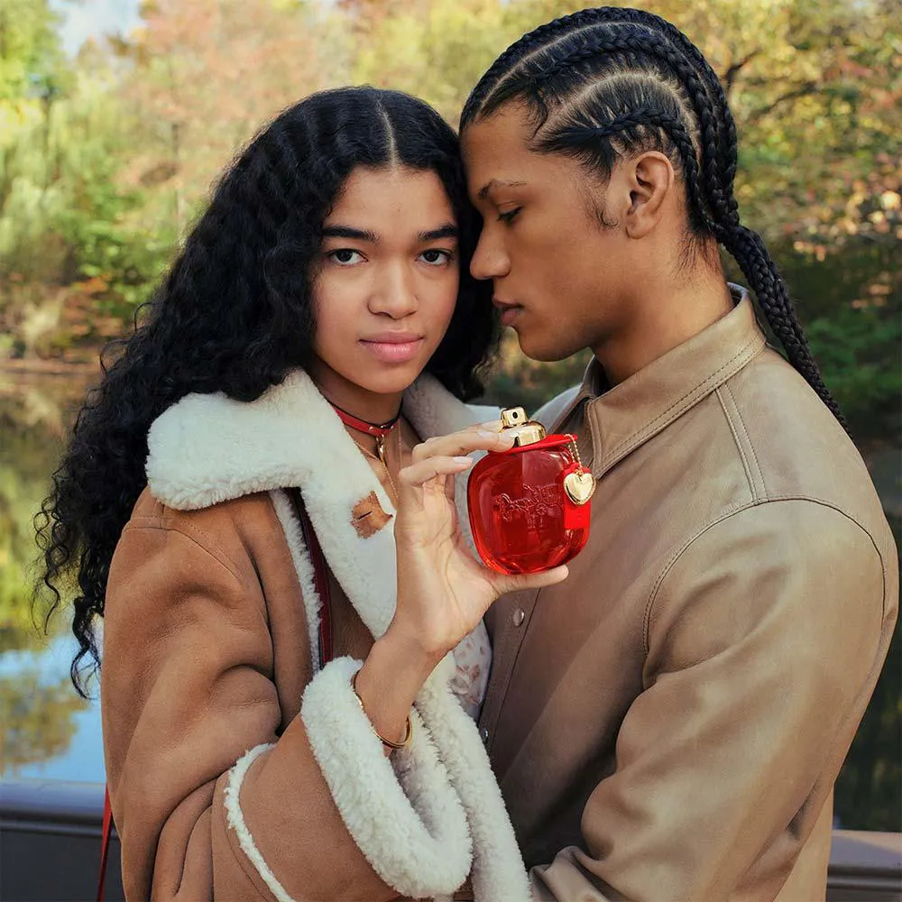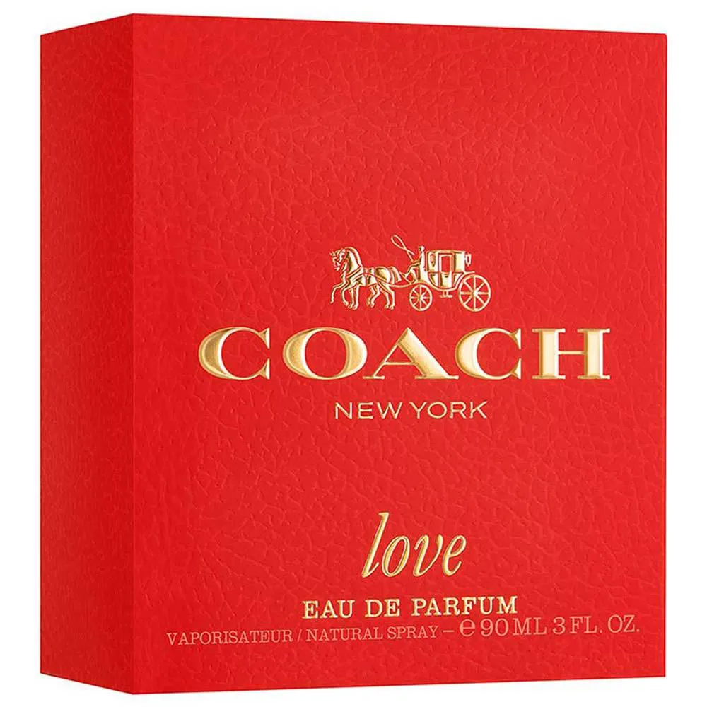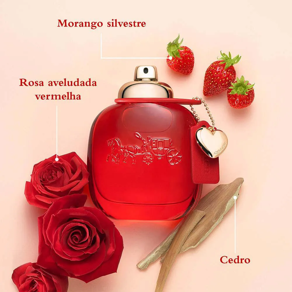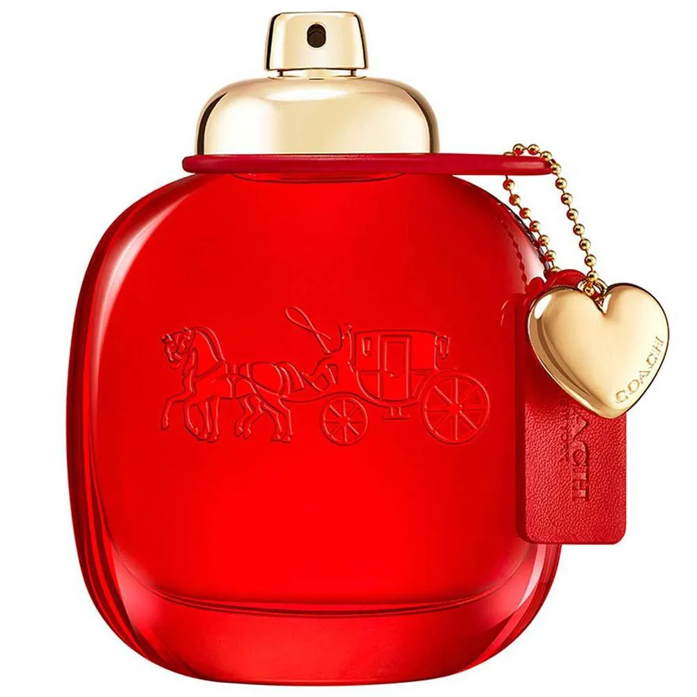 O frasco apresenta uma rica tonalidade vermelha, simbolizando a cor da paixão e as cores tradicionais do couro Coach. Ele é finalizado com o icônico turnlock da casa e detalhes dourados clássicos, incluindo um charm de coração. Apresentando o icônico logo da Carruagem com Cavalos da Coach.