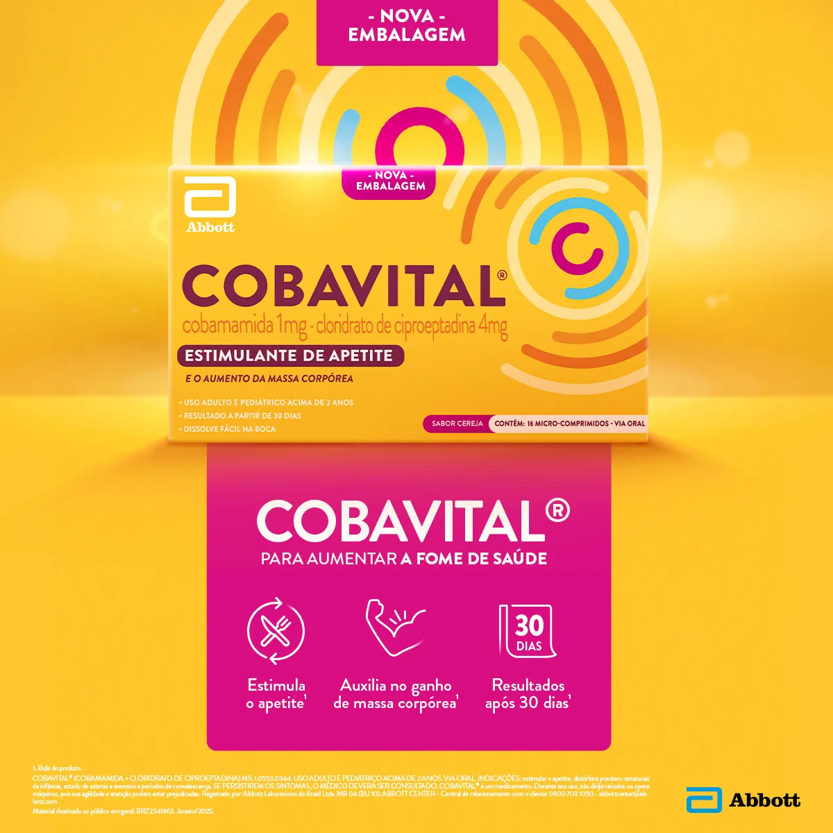 O Cobavital é um medicamento indicado para estimular o apetite e contribuir para o aumento da massa corpórea, sendo especialmente útil em casos de distúrbios no desenvolvimento de peso e estatura em crianças, estados de fraqueza e períodos de convalescença. Sua fórmula contém vitamina B12, essencial para o bom funcionamento do sistema imunológico e na prevenção de anemias, com resultados visíveis a partir de 30 dias de uso.