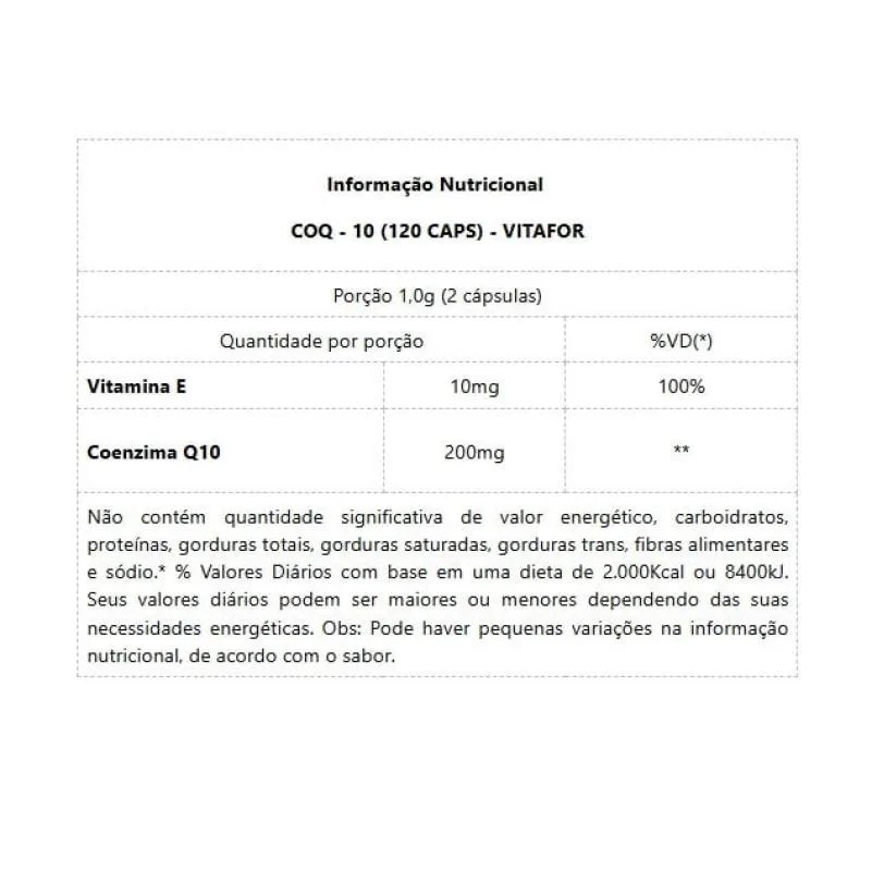 Coenzima Q10 (120 caps) A Coenzima Q10 (CoQ-10) da Vitafor é um suplemento alimentar em cápsulas, que possui 200 mg de Coenzima Q10. Contém como veículo em sua formulação TCM (triglicérides de Cadeia média). É enriquecido com vitamina E (D-L-Alfa Tocoferol) e possui corante natural de urucum. A vitamina e é um antioxidante que auxilia na proteção dos danos causados pelos radicais livres. A Coenzima Q10, também denominada Ubidecarenona, é uma benzoquinona presente em praticamente todas as células do organismo e que participa dos processos de produção de ATP (célula enérgetica). Por ser essencial nesse processo, órgãos com maior demanda energética como o coração, o cérebro, rins e fígado, apresentam maiores concentrações de CoQ10. BENEFÍCIOS * 200mg de Coenzima Q10, por porção;* Com Vitamina E;* Antioxidante potente;* Melhora a qualidade de vida na melhor idade;* Melhora o índice glicêmico;* Neuroprotetor;* Reduz o risco de lesão muscular em atletas. Embalagem disponível: pote contendo 120 cápsulas de suplemento.