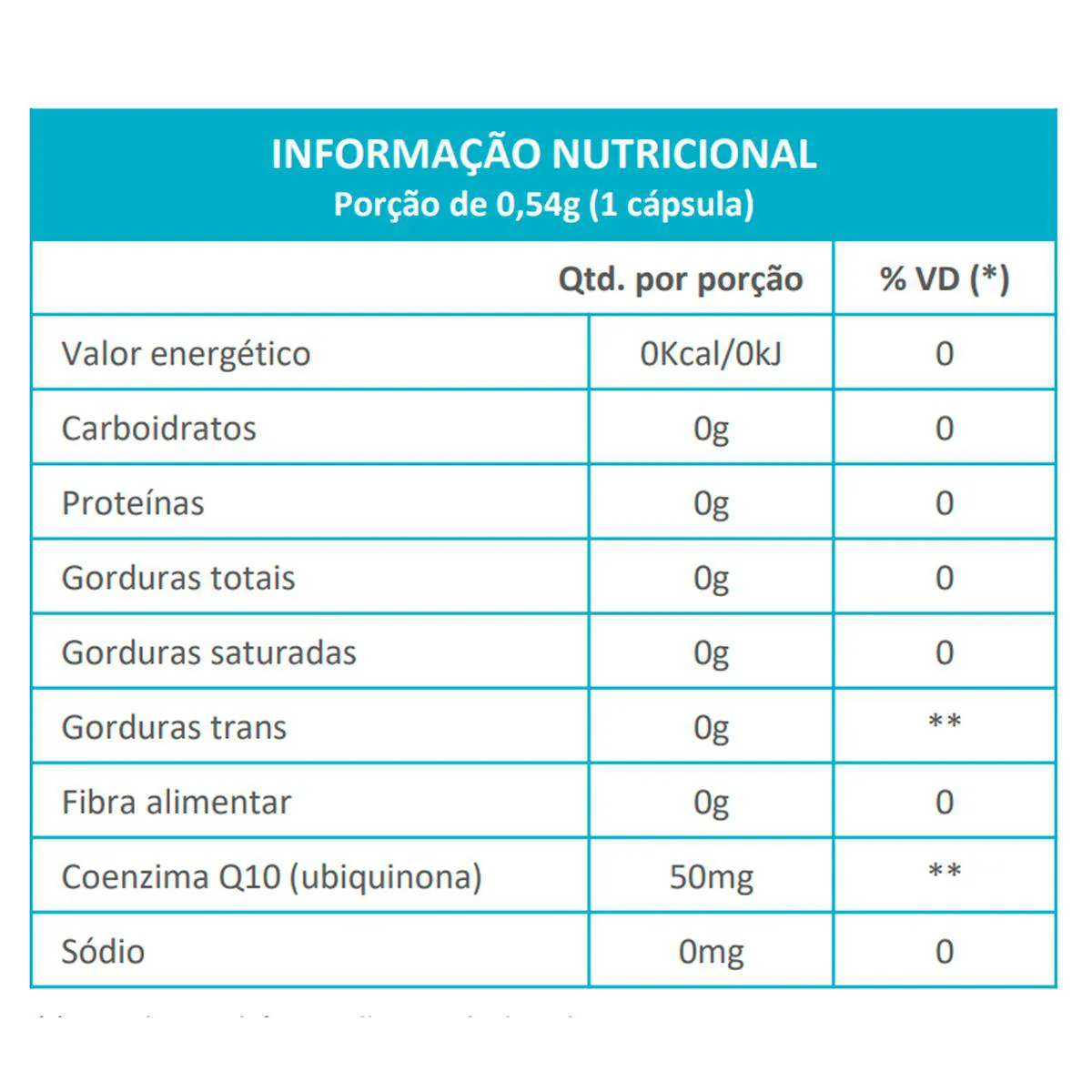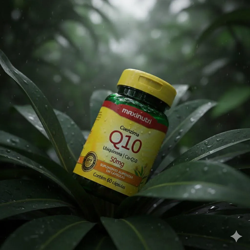 O frasco contém 60 cápsulas de 50mg. A formulação inclui coenzima Q10 associada a excipientes utilizados para estruturar as cápsulas. As orientações de uso, advertências e demais informações constam diretamente no rótulo do fabricante. Produto destinado ao público adulto.