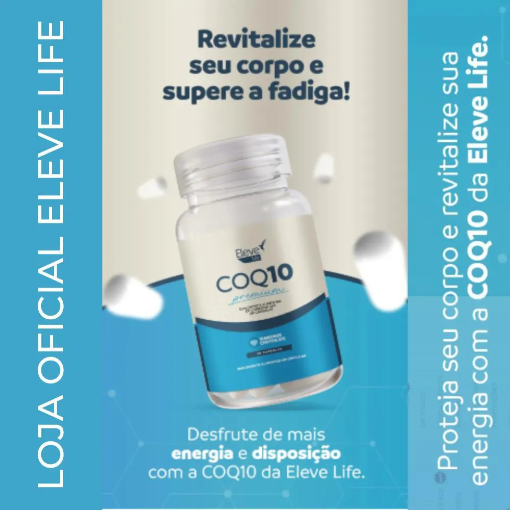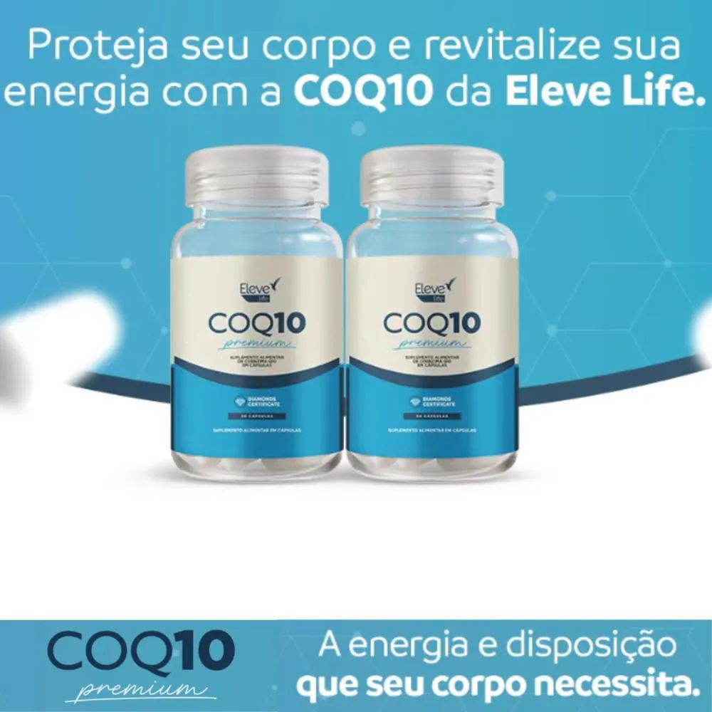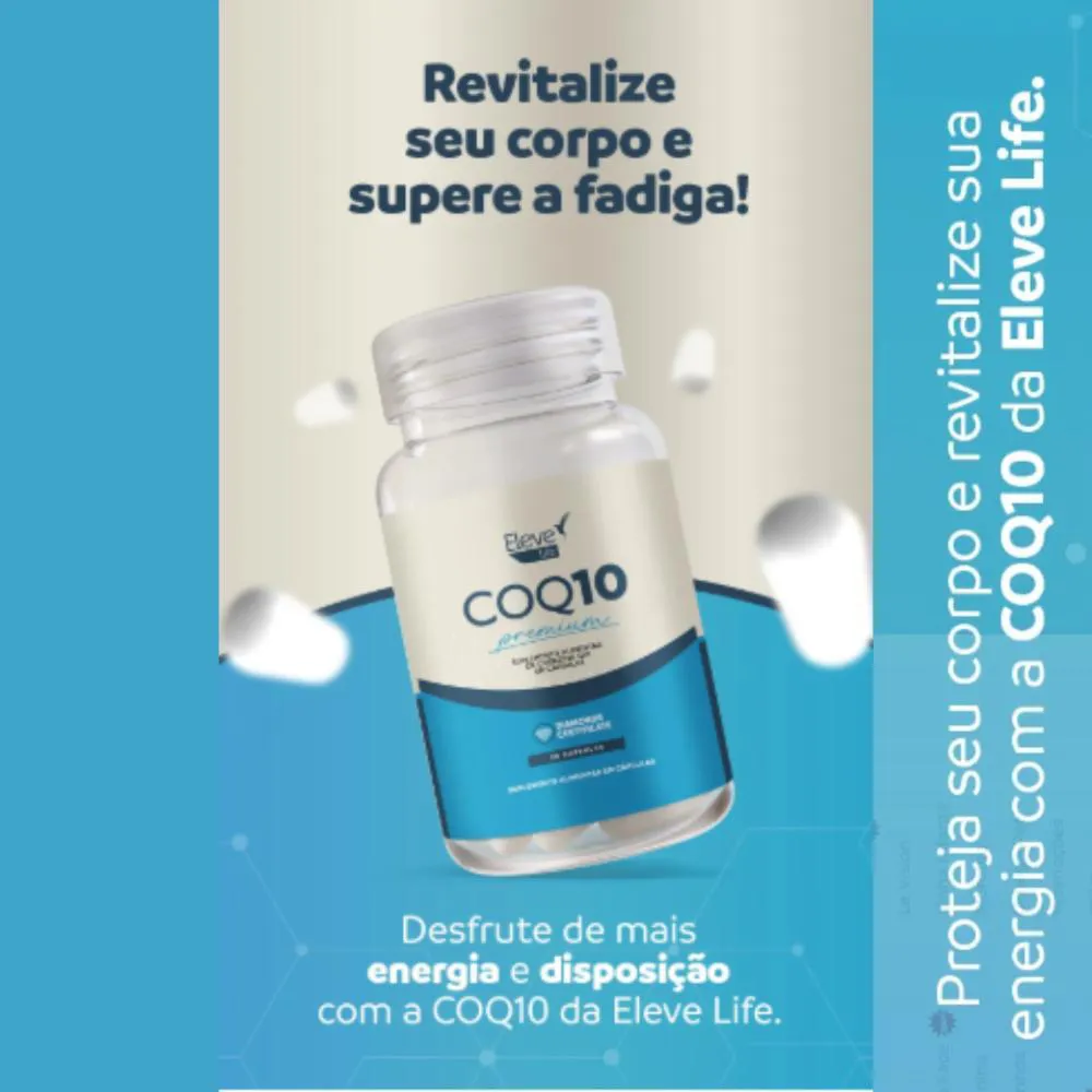 Revitalize sua energia e bem-estar com a força da Coenzima, essencial para a saúde celular e vitalidade do seu corpo. Conheça o poder da COQ10 da Eleve Life para sua saúde e vitalidade!Adeus à fadiga, olá ânimo!Você merece mais energia e disposição em sua vida, e a COQ10 da Eleve Life é a solução que você precisa. Entendemos os desafios que a busca por uma vida saudável pode trazer, desde a fadiga constante até o envelhecimento precoce, impactando diretamente o seu bem-estar. Por que escolher a COQ10 da Eleve Life? A COQ10 da Eleve Life é mais do que um suplemento; é um verdadeiro elixir de vitalidade. Nossa fórmula de alta qualidade foi desenvolvida para restaurar os níveis naturais dessa coenzima vital, que tende a diminuir com o envelhecimento. Ela atua diretamente na produção de energia celular, essencial para manter a disposição e a saúde em dia. Além disso, a COQ10 é um poderoso antioxidante que protege as células contra os danos dos radicais livres, retardando o envelhecimento precoce e promovendo uma pele mais saudável.A COQ10 da Eleve Life também oferece suporte crucial à saúde cardiovascular, otimizando a função cardíaca e promovendo uma circulação sanguínea saudável. Sua ação no cérebro ajuda a melhorar a função cognitiva, mantendo a mente ativa e protegendo contra condições neurodegenerativas. Combinada com a vitamina e, nossa COQ10 oferece uma proteção antioxidante ainda mais potente, fortalecendo seu sistema imunológico e ajudando você a viver com mais energia, equilíbrio e bem-estar diariamente.A escolha pela COQ10 da Eleve Life é a decisão certa para quem busca uma vida mais saudável e energizada, com o suporte de uma fórmula eficaz e confiável.Com a COENZIMA você vai: