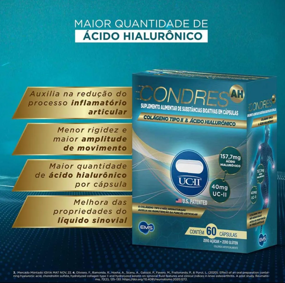 Além disso, o produto contém ácido hialurônico, responsável por manter a hidratação e firmeza da pele, ajudando a reduzir linhas de expressão e o ressecamento cutâneo. Com o uso regular, o Colágeno Condres AH apoia a regeneração tecidual, melhora a elasticidade da pele e favorece o bem-estar das articulações.