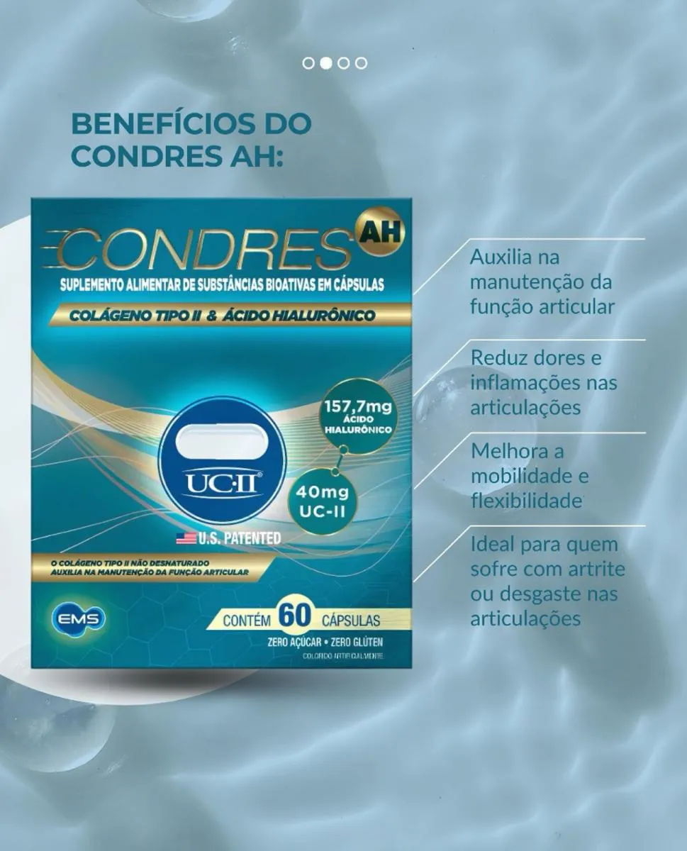 O Colágeno Condres AH é um suplemento alimentar desenvolvido para promover a saúde das articulações, pele, cabelos e unhas. Sua fórmula é rica em colágeno hidrolisado tipo II, que auxilia na manutenção da estrutura e elasticidade das cartilagens, contribuindo para maior mobilidade e conforto nas articulações.