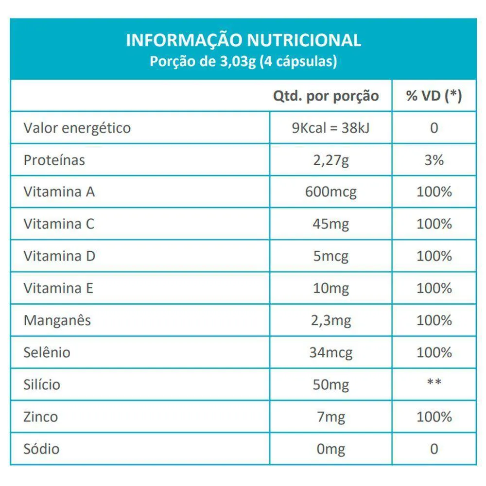 Colágeno hidrolisado em pó Verisol, vitamina A, vitamina c, vitamina d, vitamina e, manganês, selênio, silício e zinco, excipiente: silicato de magnésio, antiumectante: dióxido de silício, cápsula: gelatina e dióxido de titânio.