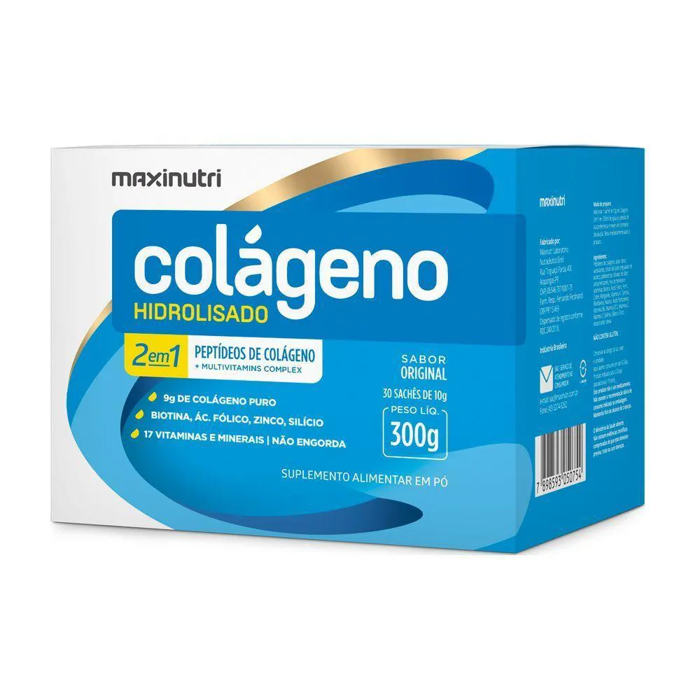 Colágeno Hidrolisado 2 em 1 Maxinutri 30 Sachês OriginalO colágeno hidrolisado é uma forma de proteína que passou por um processo de hidrólise, que quebra as moléculas de proteína em pedaços menores, chamados de peptídeos de colágeno. Esta forma de colágeno é mais facilmente absorvida pelo corpo, o que o torna popular como suplemento para promover a saúde da pele, cabelo, unhas, articulações e ossos. O 2 em 1 sugere que o produto pode oferecer múltiplos benefícios em um único suplemento.30 Sachês: Este produto é apresentado em 30 sachês individuais, o que torna conveniente para o consumo diário, seja em casa ou em movimento.Benefícios:Saúde da Pele: O colágeno é um componente essencial da pele, ajudando a mantê-la firme, elástica e hidratada. O consumo de colágeno hidrolisado pode ajudar a melhorar a elasticidade da pele, reduzir rugas e promover uma aparência mais jovem.Cabelo e Unhas: O colágeno também desempenha um papel importante na saúde do cabelo e das unhas. Suplementar com colágeno hidrolisado pode fortalecer os folículos capilares, reduzir a quebra e promover o crescimento saudável do cabelo. Além disso, pode fortalecer as unhas, prevenindo quebras e lascas.Saúde das Articulações: Os peptídeos de colágeno podem ajudar a promover a saúde das articulações, reduzindo a dor e a inflamação, melhorando a mobilidade e a flexibilidade. Isso é especialmente benéfico para pessoas que sofrem de condições como artrite ou que estão envolvidas em atividades físicas intensas.Saúde Óssea: O colágeno é um componente importante dos ossos, ajudando a mantê-los fortes e saudáveis. Suplementar com colágeno hidrolisado pode ajudar a prevenir a perda óssea relacionada à idade e reduzir o risco de osteoporose.Conveniência: A apresentação em sachês individuais torna o consumo do suplemento prático e fácil de integrar à rotina diária, seja em casa, no trabalho ou em viagens.Instruções de Uso:Geralmente, o colágeno hidrolisado é consumido dissolvendo um sachê em água, suco ou outra bebida de sua escolha, conforme as instruções do fabricante. Pode ser consumido com ou sem alimentos, dependendo das preferências pessoais.Modo de preparo:Adicionar 1 sachê de 10g de Colágeno 2 em 1 em 250ml água ou bebida de sua preferência e mexer até completa dissolução. Beba imediatamente após o preparo.Ingredientes: Peptídeos de colágeno, ácido cítrico (acidulante), citrato de sódio (regulador de acidez), polidextrose, dióxido de silício (antiumectante), mix deminerais e vitaminas: biotina, ácidofólico, ferro, cobre,manganês, vitamina A, vitamina B1, vitamina B2, vitamina B3, vitamina B5, vitamina B6, vitamina B12, vitamina c, vitamina e , selênio, silícioezinco, edulcorante: stevia. NÃO CONTÉM GLÚTEN