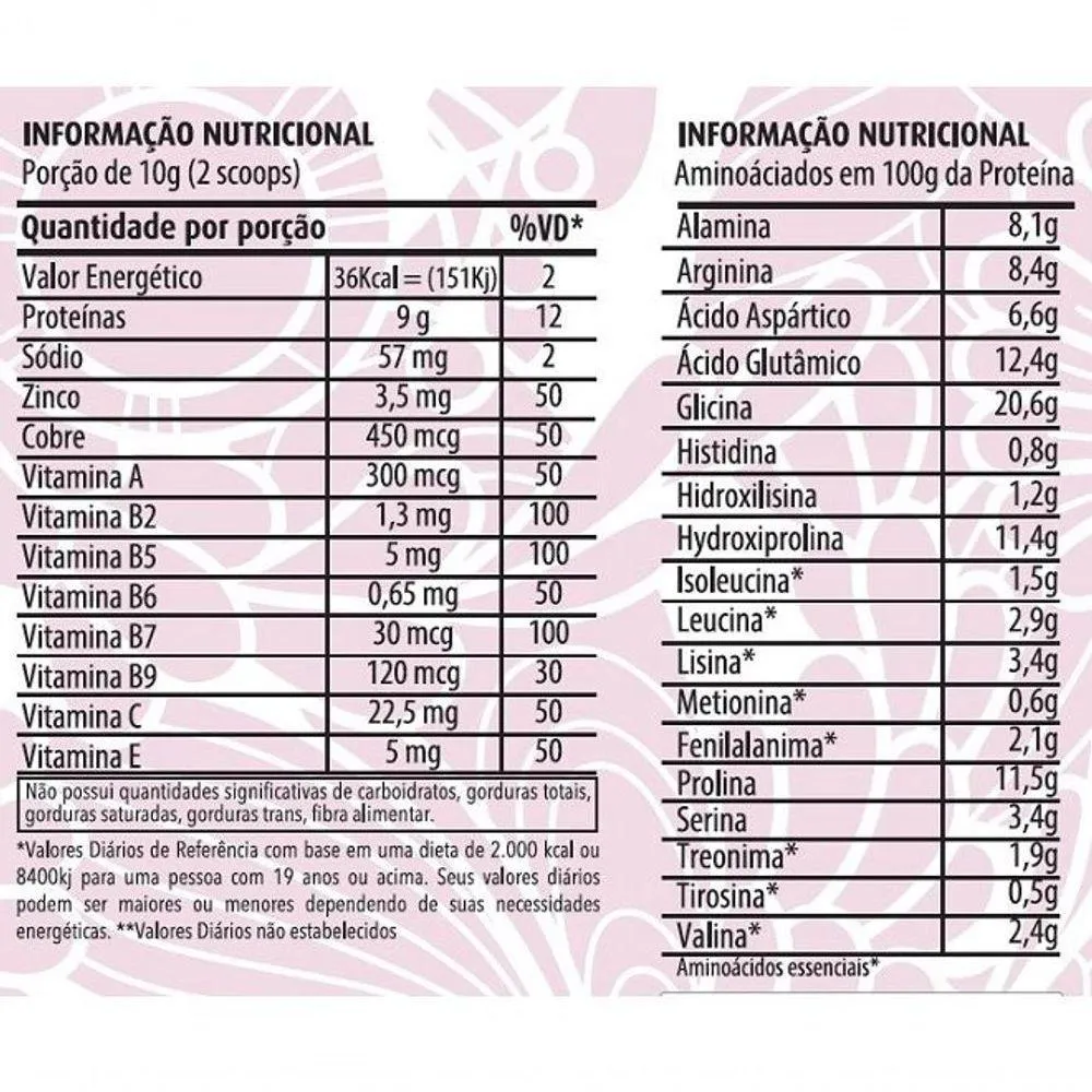 Informação Nutricional COLÁGENO HIDROLISADO BEAUTY COMPLEX (200g) - APISNUTRIPorção de 10g (2 scoops)Quantidade por porção%VD(*)Valor Energético36kcal=151kj2Proteínas9g12Sódio57mg2Zinco3,5mg50Cobre450mcg50Vitamina A300mcg50Vitamina B21,3mg100Vitamina B55mg100Vitamina B60,65mg50Vitamina B730mcg100Vitamina B9120mcg30Vitamina C22,5mg50Vitamina E5mg50* % Valores Diários com base em uma dieta de 2.000Kcal ou 8400kJ. Seus valores diários podem ser maiores ou menores dependendo das suas necessidades energéticas. Obs: Pode haver pequenas variações na informação nutricional, de acordo com o sabor. AMINOÁCIDOS EM 100G DE PROTEÍNASAlanina8,1gArginina8,4gÁcido Aspartico6,6gÁcido Glutâmico12,4gGlicina20,6gHistidina0,8gHidroxilisina1,2gHydroxiprolina11,4gIsoleucina1,5gLeucina2,9gLisina3,4gMetionina0,6gFenilalanina2,1gProlina11,5gSerina3,4gTreonina1,9gTirosina0,5gValina2,4g