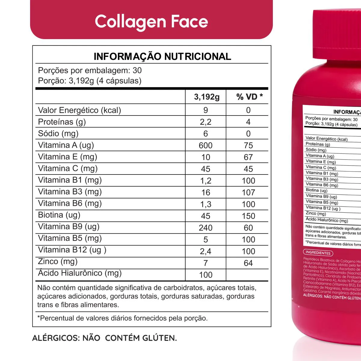 Cada embalagem de Colágeno hidrolisado verisol Collagen Face Vhita rende em média 30 dias de consumo.Você receberá 3 unidades (cada 1 com 120 cápsulas).Sugestão de consumo: 4 cápsulas ao dia.Validade: Superior a 12 meses. Sabor: Sem sabor ( cápsula) Ingredientes de Colágeno hidrolisado verisol Collagen Face Vhita: Peptídeos Bioativos de Colágeno Hidrolisado com Peso Molecular Médio de 2kDa, Hialuronato de Sódio obtido pela fermentação de Streptococcus zoopidemicus (Fonte de Ácido Hialurônico), Ascorbato de Sódio (vitamina c), Acetato de dl-alfa Tocoferila (vitamina e), Nicotinamida (Niacina), Óxido de Zinco, d-Pantotenato de Cálcio (Ácido Pantotênico), Cloridrato de Piridoxina (vitamina B6), Acetato de Retinila (Vitamina A), Ácido N-Pteroil I-Glutâmico (Ácido Fólico), d-Biotina (Biotina), Cianocobalamina (Vitamina B12), Estabilizante: Celulose Microcristalina, Lubrificante: Estearato de Magnésio, Antiumectante: Dióxido de silício, Composição da Cápsula: Gelatina, Dióxido de Titânio, Corante e Água.
