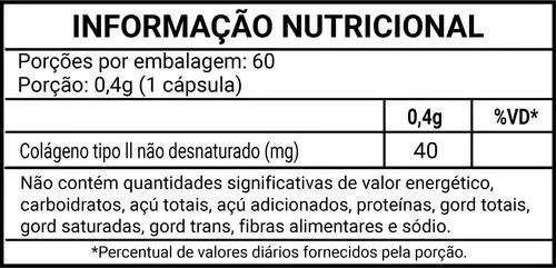 Colágeno de frango com colágeno tipo II não desnaturado, silicato de magnésio (INS 553i), dióxido de silício (INS 551). Composição da cápsula: gelatina, dióxido de titânio, azul brilhante FCF e vermelho Allura AC.