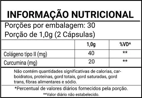 Extrato de rizomas de cúrcuma longa, silicato de magnésio e colágeno tipo II; Composição da Cápsula: Gelatina, umectante glicerina e corante dióxido de titânio.