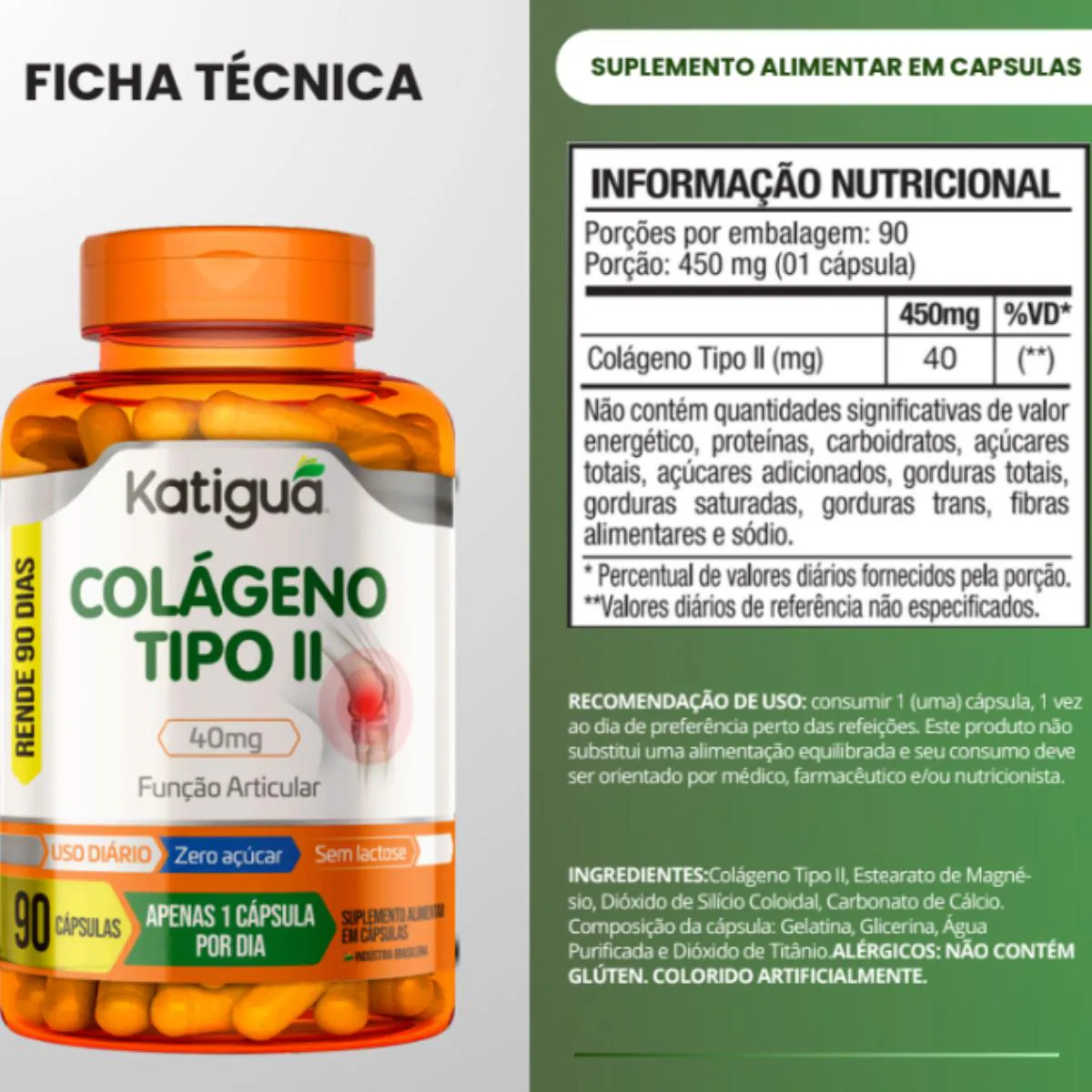 Suplemento alimentar com alta concentração de colágeno tipo II, desenvolvido para auxiliar na manutenção da saúde das articulações.Benefícios: