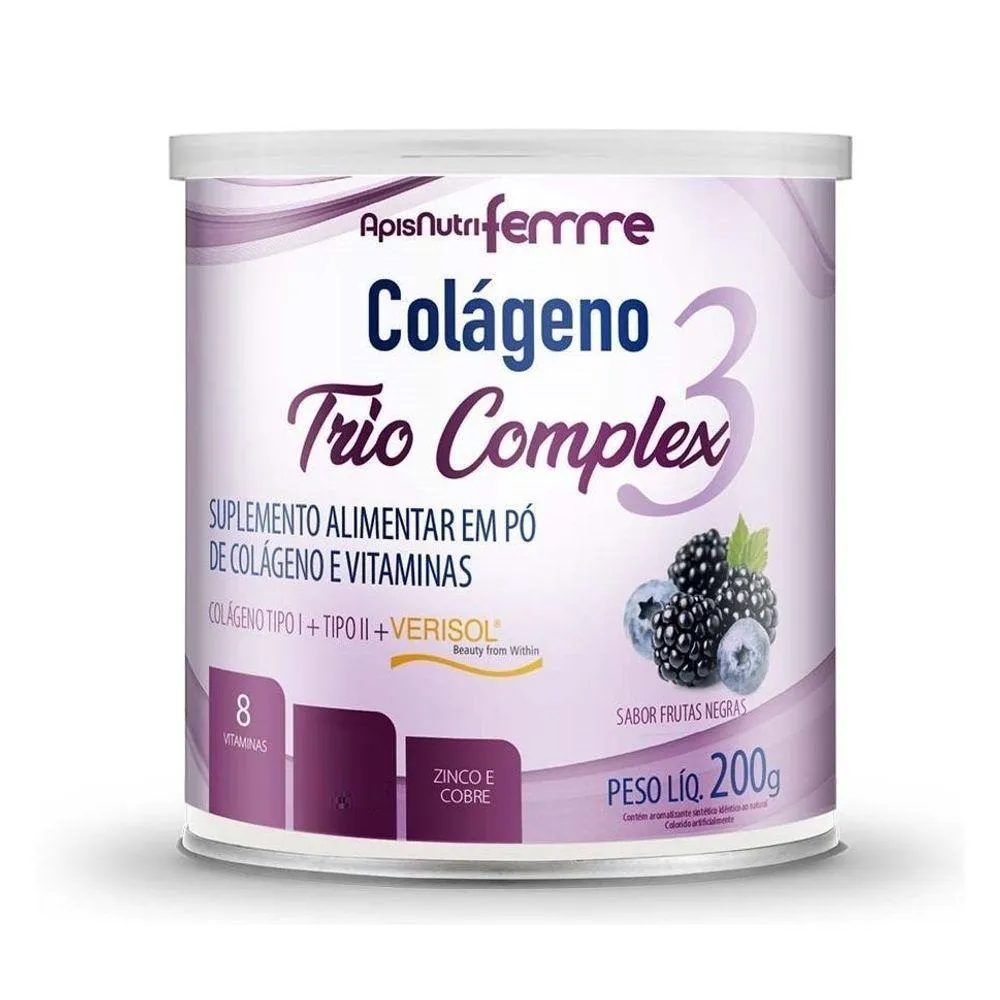 Colágeno Trio Complex3 (200g) - ApisNutri O Colágeno Trio Complex da Apisnutri Femme tem em sua composição o colágeno tipo 1, que é eficaz para pele, unhas e cabelos mais saudáveis. Possui também aminoácidos essenciais que estimulam o seu organismo a produzir colágeno de forma natural. Contém o colágeno tipo 2, que reconstrói a cartilagem das articulações, facilitando a sua mobilidade. É anti-inflamatório natural, portanto, alivia as dores que o desgaste causa nas articulações. O diferencial do Colágeno Trio Complex é que ele contém o Verisol, um tipo de colágeno hidrolisado com partículas menores, que são melhor absorvidas e distribuídas no organismo, assim o seu resultado é mais rápido e eficaz. Ele também contém vitaminas e minerais importantíssimas para absorção do colágeno no organismoBenefícios: * Promove diminuição da flacidez e consequentemente hidratação cutânea;* Auxilia na melhora do aspecto da celulite e elasticidade da pele;* Controle de linhas de expressões e rugas;* Proporciona efeitos positivos na saúde dos ossos e articulações;* Estimula a fortificação de unhas e cabelos;* Maior concentração de aminoácidos específicos como glicina e arginina;* Adicionada de vitaminas e minerais antioxidantes;* Resultando em peptídeos menores de fácil e rápida absorção e digestão.