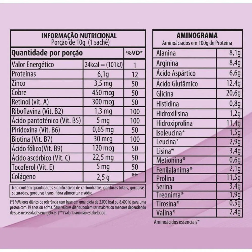 - Contém colágeno tipo 1 e 2 para pele e articulações.