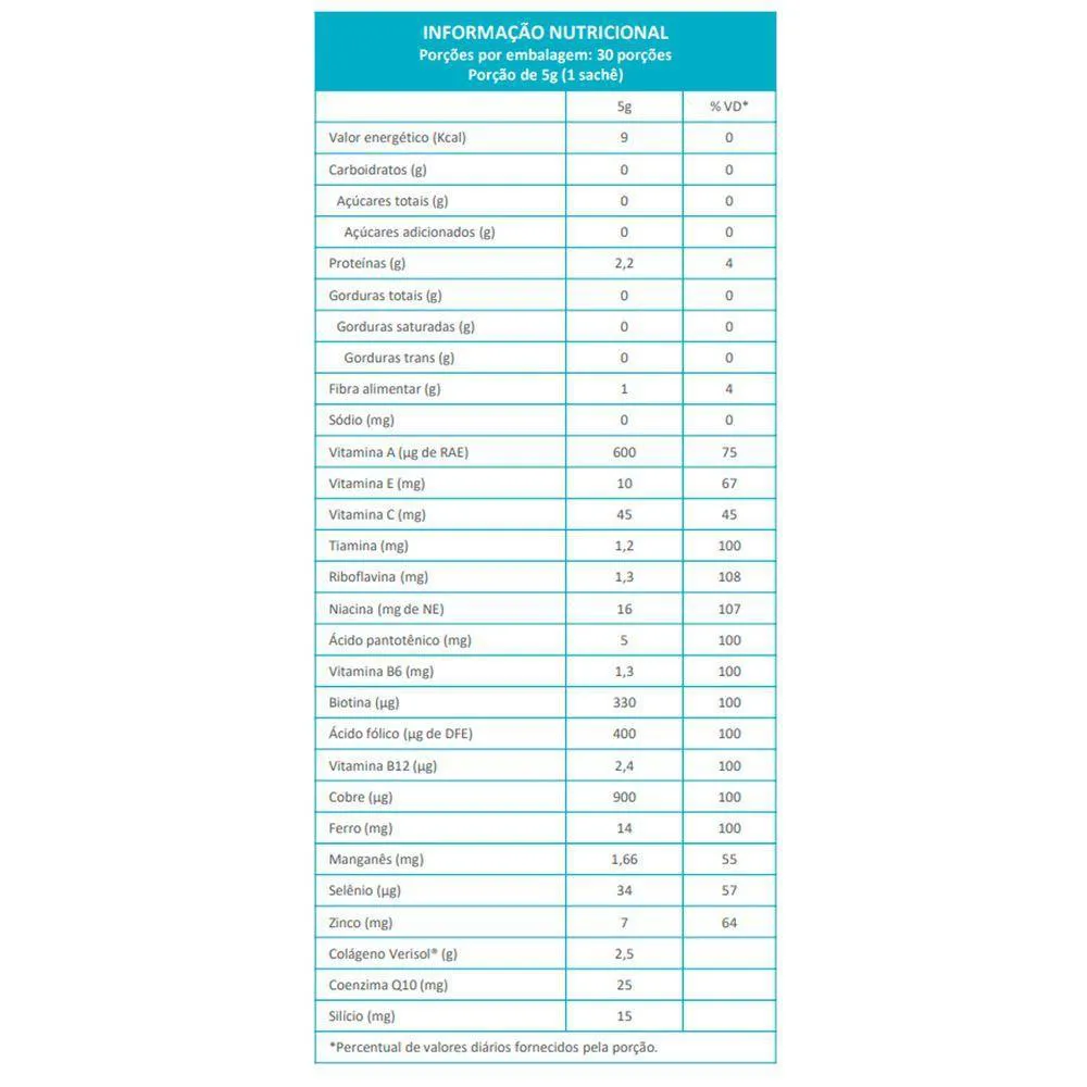 Peptídeos Bioativos de Colágeno Hidrolisado com peso molecular médio de 2kDa (Verisol), coenzima Q10 (ubiquinona), ácido ascórbico (vitamina c), tiamina mononitrato (vitamina B1), riboflavina (vitamina B2), niacinamida (vitamina B3), D-pantotenato de cálcio (vitamina B5), cloridrato de piridoxina (vitamina B6), ácido fólico (vitamina B9), cianocobalamina (vitamina B12), D-biotina (biotina), acetato de retinol (vitamina A), D-alfa-tocoferol (vitamina e), sulfato cúprico (cobre), selenito de sódio (selênio), sulfato de zinco (zinco), sulfato de manganês (manganês), pirofosfato férrico (ferro), ácido ortosilícico estabilizado em maltodextrina* (slício), acidulante: ácido cítrico, regulador de acidez: