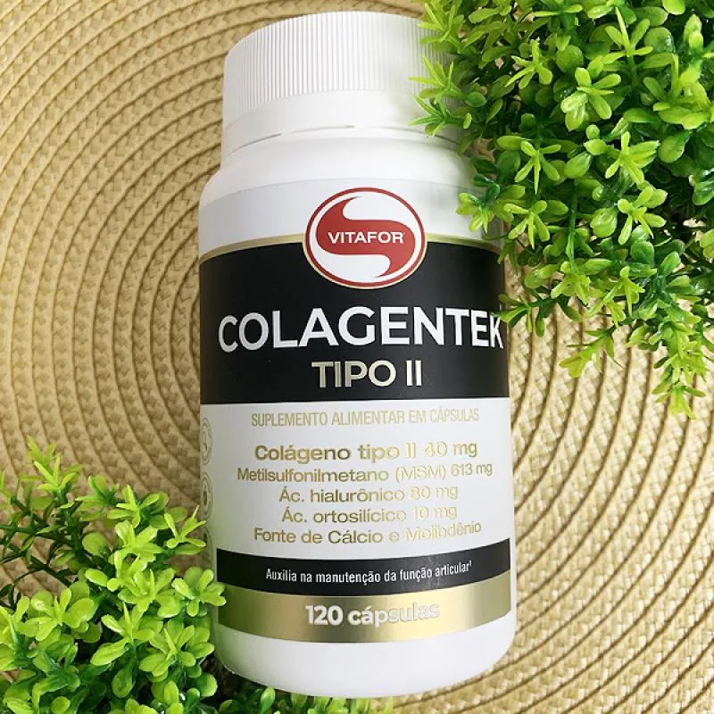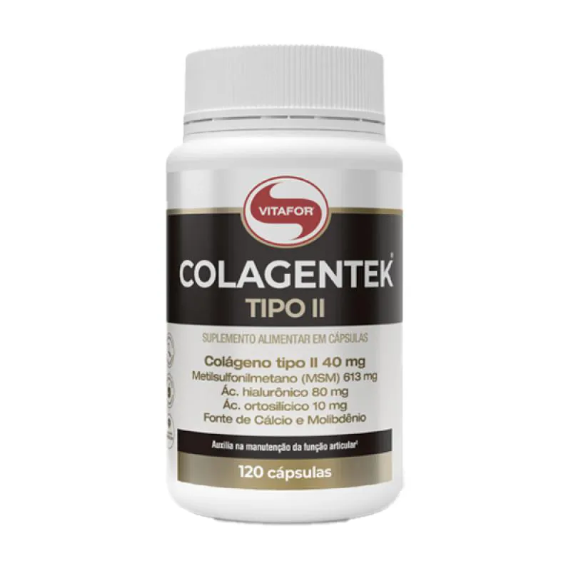 O Colagentek II colágeno Vitafor 120 Cápsulas é um suplemento alimentar à base de colágeno tipo II, metilsulfonilmetano (MSM), ácido hialurônico, extrato de alho em pó (Allium sativum L.) e minerais, com zero adição de açúcares.