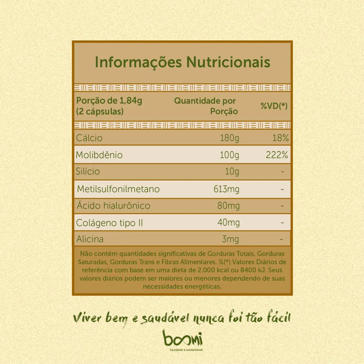 Ingredientes: Metilsulfonilmetano (MSM), fosfato tricálcico (cálcio), extrato de alho em pó (Allium sativum L.), alicina, colágeno de frango com colágeno tipo II não desnaturado, hialuronato de sódio obtido pela fermentação de Streptococcus zoopidemicus (ácido hialurônico), ácido ortosilícico estabilizado em cloreto de colina (silício), molibdato de sódio diidratado (molibdênio), agente de massa celulose microcristalina e antiumectante estearato de magnésio. Composição da cápsula: Hidroxipropilmetilcelulose (HPMC), água purificada, opacificador (corante carbonato de cálcio e amido modificado), gelificante carragena e regulador de acidez acetato de potássio. NÃO CONTÉM GLÚTEN.