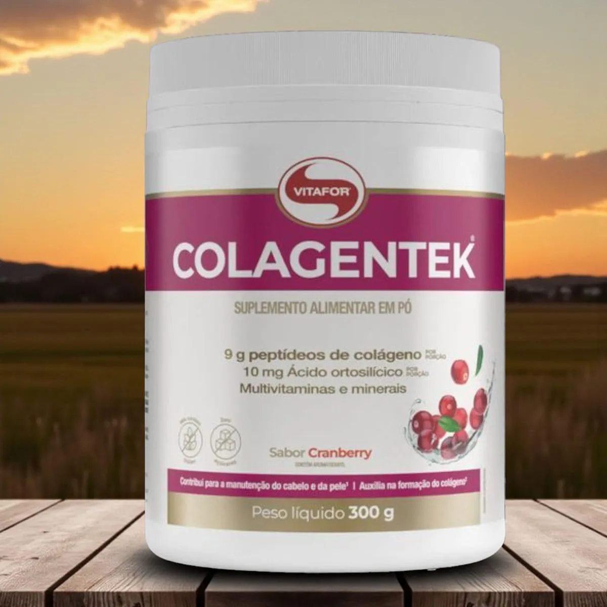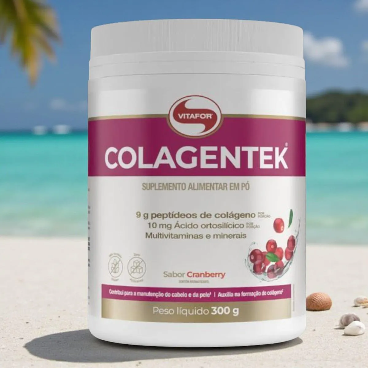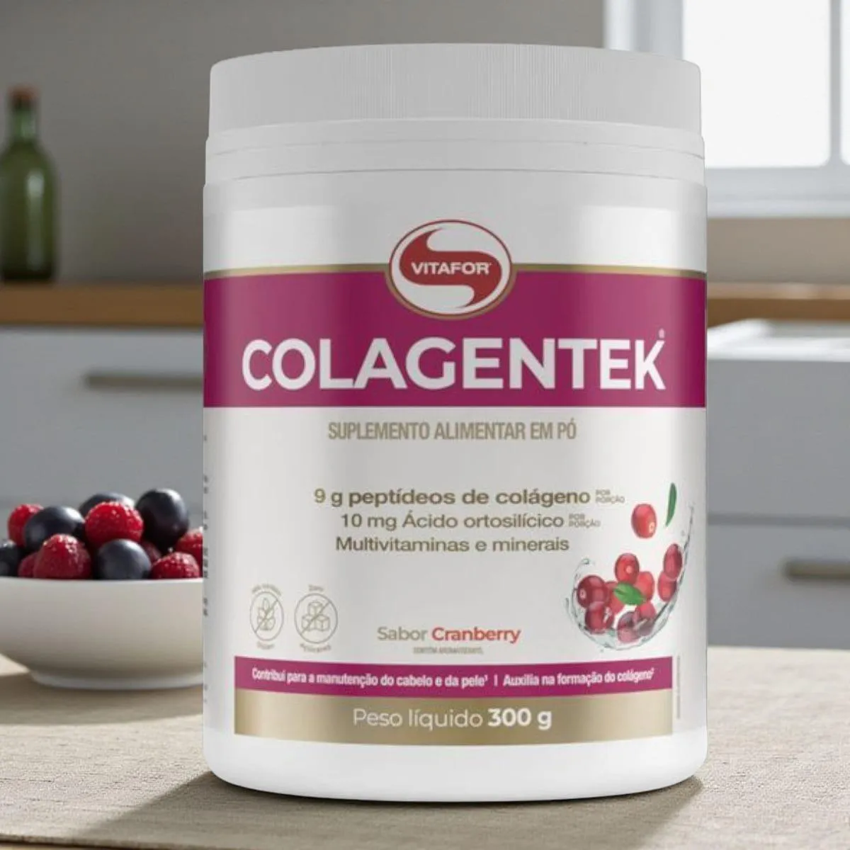 COLAGENTEK® É um suplemento alimentar em pó à base de peptídeos de colágeno, com zero adição de açúcares e enriquecido com vitaminas e minerais. SABOR CRANBERRY: Peptídeo de colágeno, premix de vitaminas e minerais [ácido ascórbico (vitamina c), niacinamida (vitamina B3), acetato de DL-alfa-tocoferol (vitamina e), D-pantotenato de cálcio (vitamina B5), sulfato de manganês (manganês), cloridrato de piridoxina (vitamina B6), sulfato cúprico (cobre), acetato de retinol (vitamina A), ácido fólico (vitamina B9), D-biotina (vitamina B7), colecalciferol (vitamina d) e cianocobalamina (vitamina B12)], ácido ortosilícico estabilizado em cloreto de colina (silício), acidulante ácido cítrico, aroma natural, espessante goma xantana, corantes naturais carmim e urucum, edulcorantes glicosídeos de esteviol (estévia) e taumatina e antiumectante dióxido de silício. NÃO CONTÉM GLÚTEN. Benefícios:- A biotina contribui para a manutenção do cabelo e da pele;