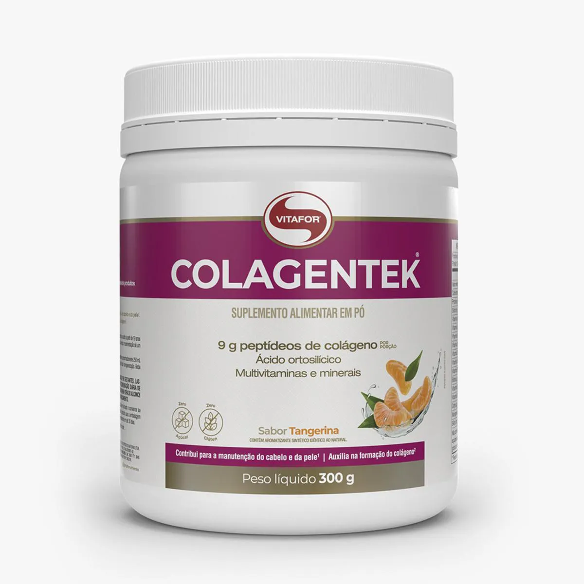 Colagentek Vitafor 300g Tangerina COLAGENTEK é um suplemento alimentar à base de colágeno hidrolisado. Colagentek Vitafor é referência em colágeno, quanto à composição, sabor e praticidade no consumo. A combinação de 9g de colágeno hidrolisado por porção, associada a vitaminas e minerais. Diferenciais: - Contém 9,0g de proteína de colágeno por porção.
