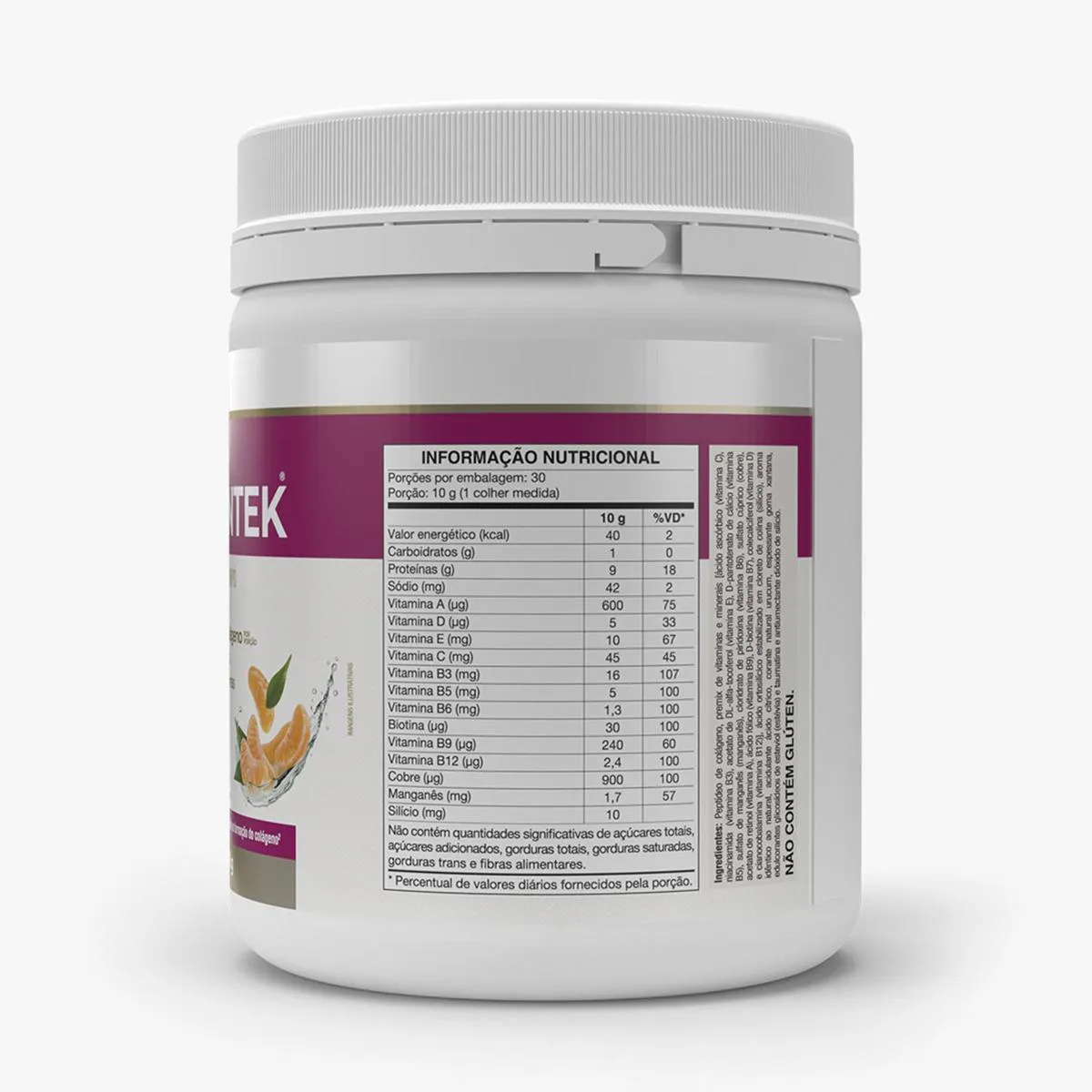 Peptídeo de colágeno, premix de vitaminas e minerais [ácido ascórbico (vitamina c), nicotinamida (vitamina B3), acetato de DL-alfa- tocoferol (vitamina e), D-pantotenato de cálcio (vitamina B5), sulfato de manganês (manganês), cloridrato de piridoxina (vitamina B6), sulfato cúprico (cobre), acetato de retinol (vitamina A), ácido fólico (vitamina B9), D-biotina (vitamina H), colecalciferol (vitamina d) e cianocobalamina (vitamina B12)], ácido ortosilícico estabilizado em cloreto de colina (silício), aroma idêntico ao natural de tangerina, acidulante ácido cítrico, corante natural urucum, espessante goma xantana, edulcorantes glicosídeos de esteviol (estévia) e taumatina e antiumectante dióxido de silício. NÃO CONTÉM GLÚTEN.