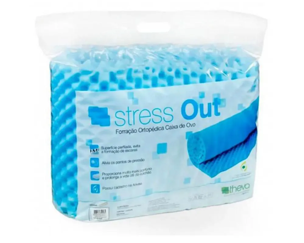Conforto e Prevenção de Escaras para um sono MelhorO Colchão Caixa de Ovo Stress Out Densidade 33 da Theva é projetado para ser usado como uma forração sobre o colchão convencional, oferecendo benefícios adicionais de conforto e saúde. Sua superfície perfilada é ideal para prevenir o aparecimento de escaras e proporcionar uma massagem suave que ativa a circulação sanguínea enquanto você dorme.Benefícios do Produto:Superfície Perfilada: A estrutura "caixa de ovo" promove a circulação do ar e previne a formação de escaras.