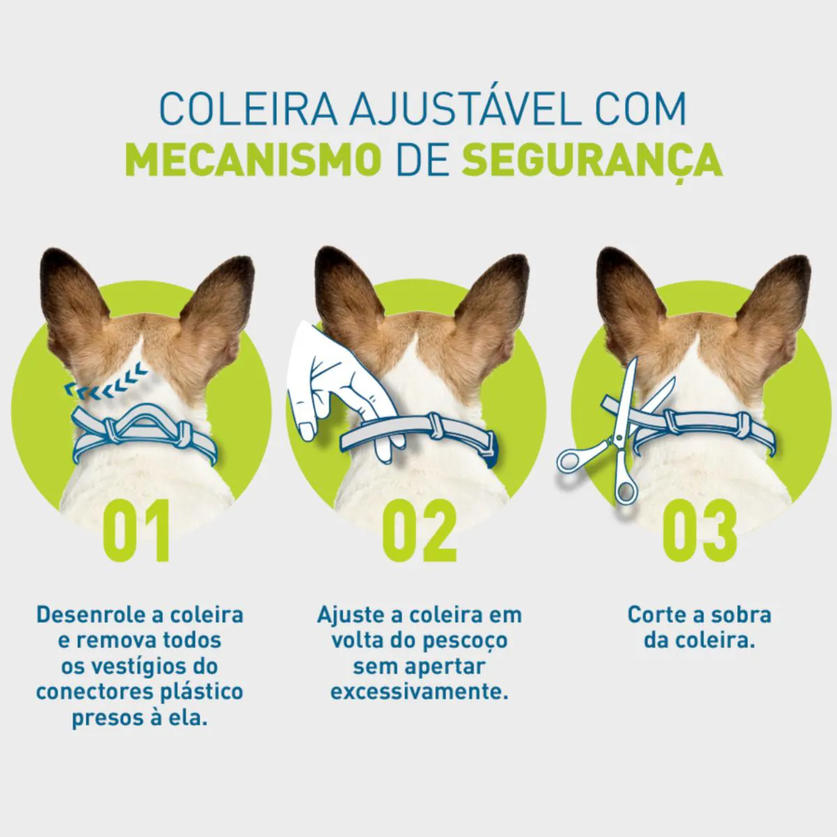 Ajuste a coleira em torno do pescoço do seu cachorro, de forma justa, sem apertar excessivamente (deve possibilitar inserir dois dedos entre a coleira e o pescoço).