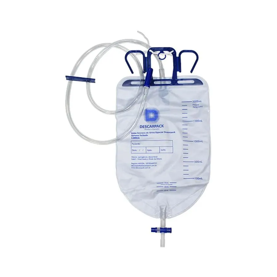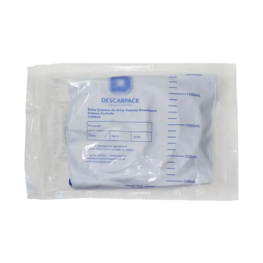 COLETOR DE URINA SISTEMA FECHADO C/ VALVULA 2000 ML DESCARPACK A Bolsa Coletora de Urina Especial 2L da Descarpack é um produto desenvolvido para a coleta, armazenamento, drenagem e monitoramento do volume urinário. A bolsa é utilizada em conjunto com a sonda de Foley ou Nelaton, em pacientes que possuem retenção ou incapacidade de urinar, ou que apresentam incontinência urinária. É apresentada no modelo especial, sem ponto de coleta de amostra. * Confeccionado em PVC atóxico e apirogênico;