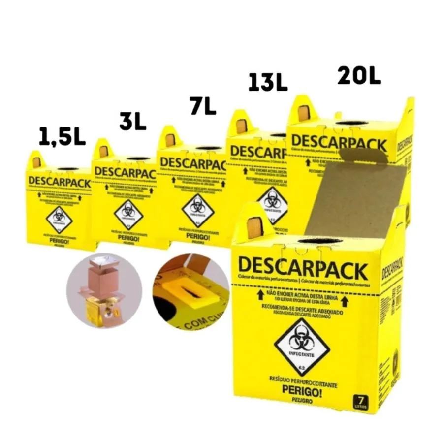 - Fabricado pela Descarpack, marca reconhecida em produtos para descarte de materiais hospitalares.